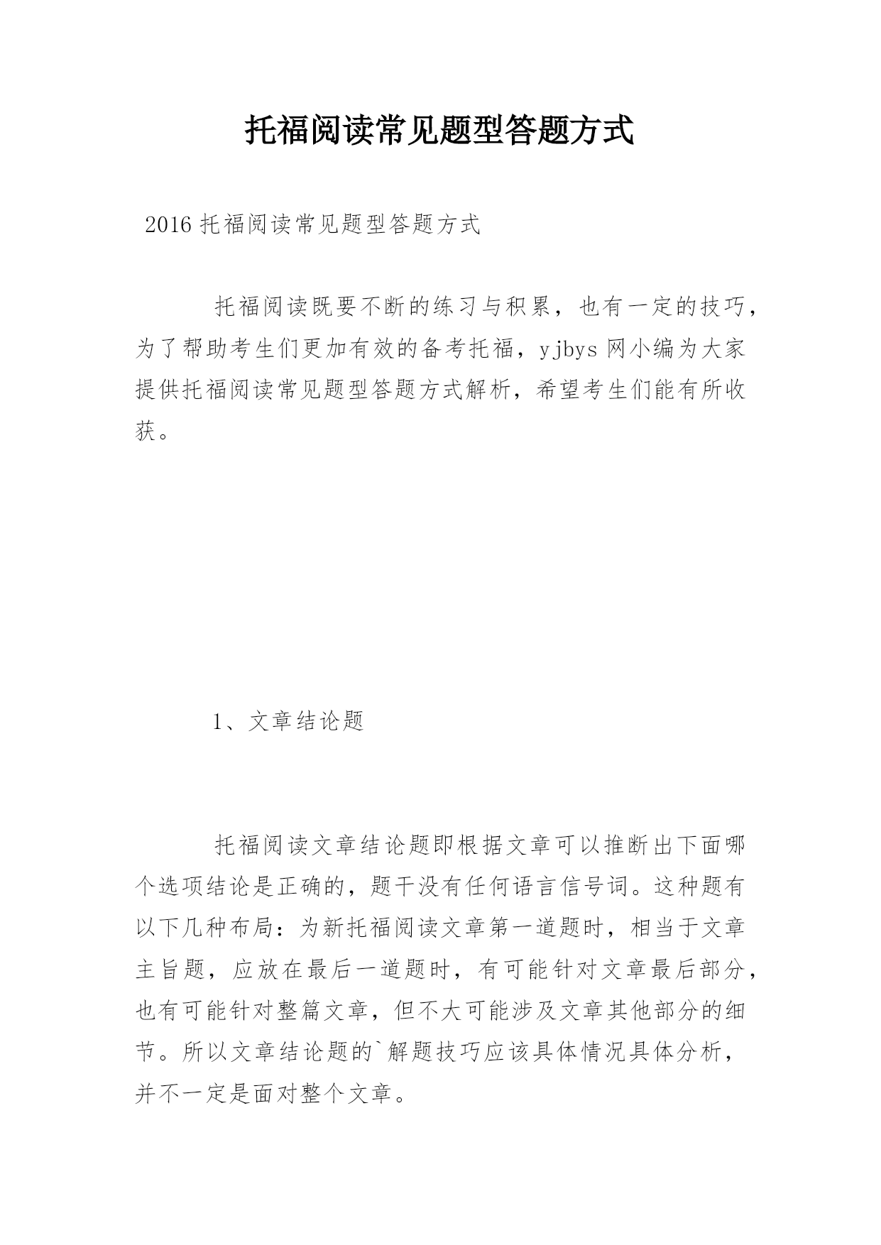 托福阅读常见题型答题方式2016托福阅读常见题型答题方式托福阅读既要不断的练习与积累,也有一定的技巧,为了帮助考生们更加有效的备考托福,yjbys网小编为大家提供托福阅读常见题型答题方式解析,希望考生们能有所收获。1、文章结论题托福阅读文章结论题即根据文章可以推断出下面哪个选项结论是正确的,题干没有任何语言信号词。这种题有以下几种布局:为新托福阅读文章第一道题时,相当于文章主旨题,应放在最后一道题时,有可能针对文章最后部分,也有可能针对整篇文章,但不大可能涉及文章其他部分的细节。所以文章结论题的`解题技巧