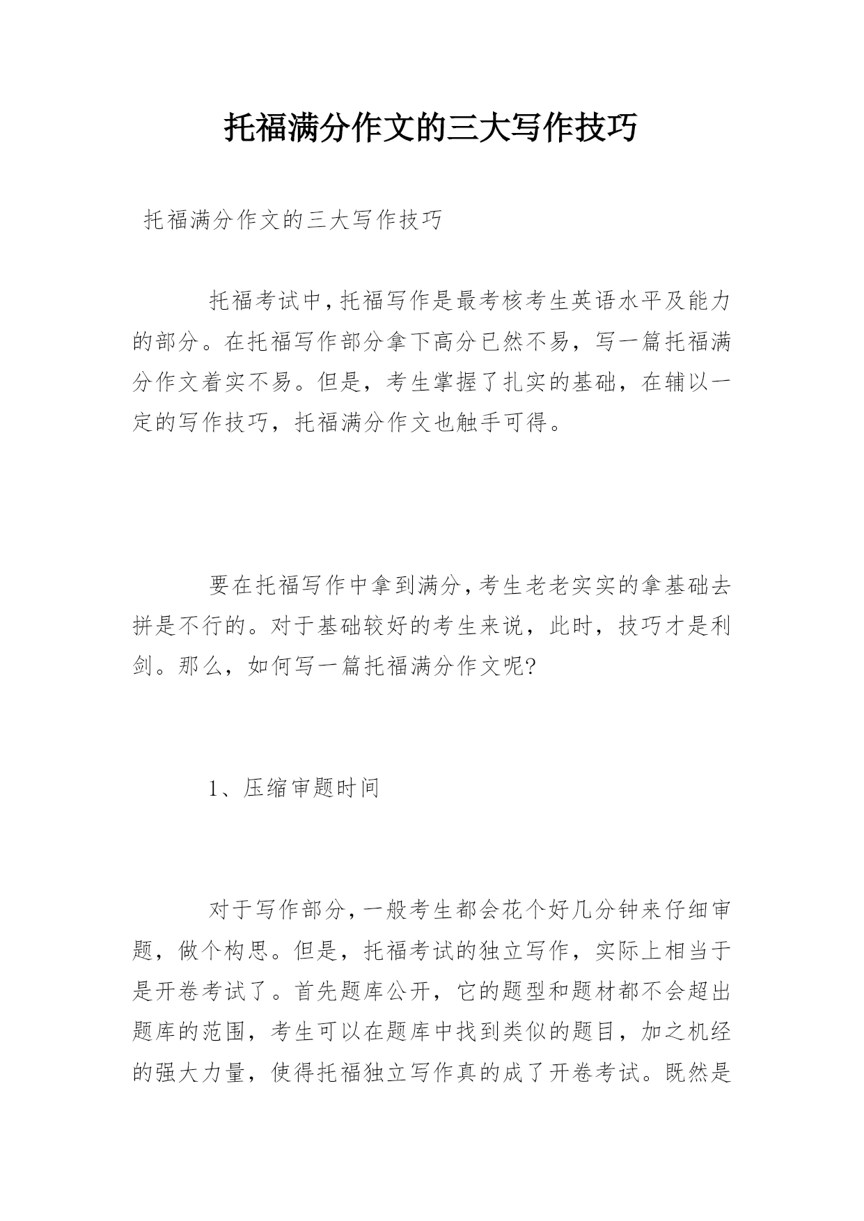 托福满分作文的三大写作技巧托福满分作文的三大写作技巧托福考试中,托福写作是最考核考生英语水平及能力的部分。在托福写作部分拿下高分已然不易,写一篇托福满分作文着实不易。但是,考生掌握了扎实的基础,在辅以一定的写作技巧,托福满分作文也触手可得。要在托福写作中拿到满分,考生老老实实的拿基础去拼是不行的。对于基础较好的考生来说,此时,技巧才是利剑。那么,如何写一篇托福满分作文呢?1、压缩审题时间对于写作部分,一般考生都会花个好几分钟来仔细审题,做个构思。但是,托福考试的独立写作,实际上相当于是开卷考试了。首先题库