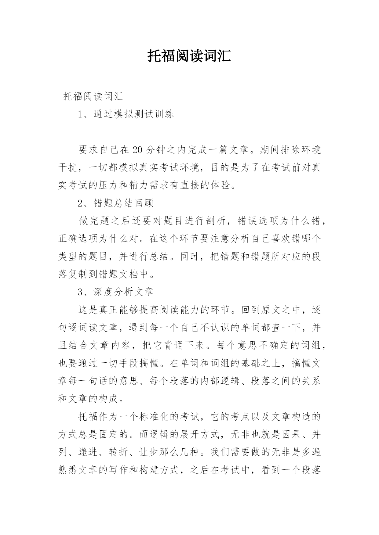 托福阅读词汇托福阅读词汇1、通过模拟测试训练要求自己在20分钟之内完成一篇文章。期间排除环境干扰,一切都模拟真实考试环境,目的是为了在考试前对真实考试的压力和精力需求有直接的体验。2、错题总结回顾做完题之后还要对题目进行剖析,错误选项为什么错,正确选项为什么对。在这个环节要注意分析自己喜欢错哪个类型的题目,并进行总结。同时,把错题和错题所对应的段落复制到错题文档中。3、深度分析文章这是真正能够提高阅读能力的环节。回到原文之中,逐句逐词读文章,遇到每一个自己不认识的单词都查一下,并且结合文章内容,把它背诵下