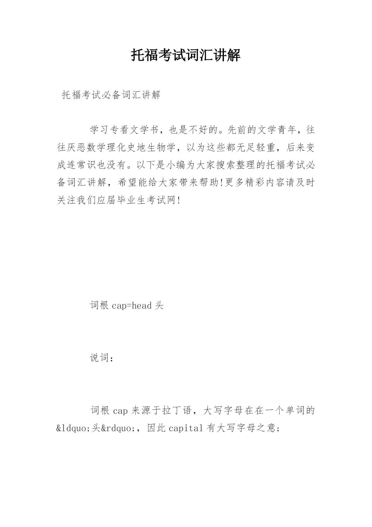托福考试词汇讲解托福考试必备词汇讲解学习专看文学书,也是不好的。先前的文学青年,往往厌恶数学理化史地生物学,以为这些都无足轻重,后来变成连常识也没有。以下是小编为大家搜索整理的托福考试必备词汇讲解,希望能给大家带来帮助!更多精彩内容请及时关注我们应届毕业生考试网!词根cap=head头说词:词根cap来源于拉丁语,大写字母在在一个单词的“头”,因此capital有大写字母之意;一个国家的首都就是一个国家的“头”所在,也是capital;capital还有资本