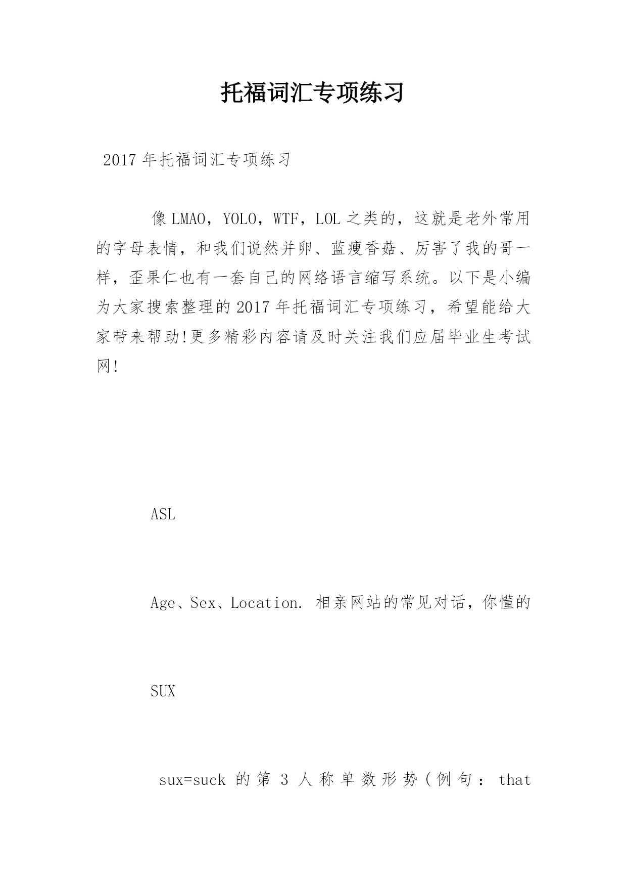 托福词汇专项练习2017年托福词汇专项练习像LMAO,YOLO,WTF,LOL之类的,这就是老外常用的字母表情,和我们说然并卵、蓝瘦香菇、厉害了我的哥一样,歪果仁也有一套自己的网络语言缩写系统。以下是小编为大家搜索整理的2017年托福词汇专项练习,希望能给大家带来帮助!更多精彩内容请及时关注我们应届毕业生考试网!ASLAge、Sex、Location.相亲网站的常见对话,你懂的SUXsux=suck的第3人称单数形势(例句:thatsux=sb);滥,差劲PPLPeople,人。以前总是看到很多朋友说pp