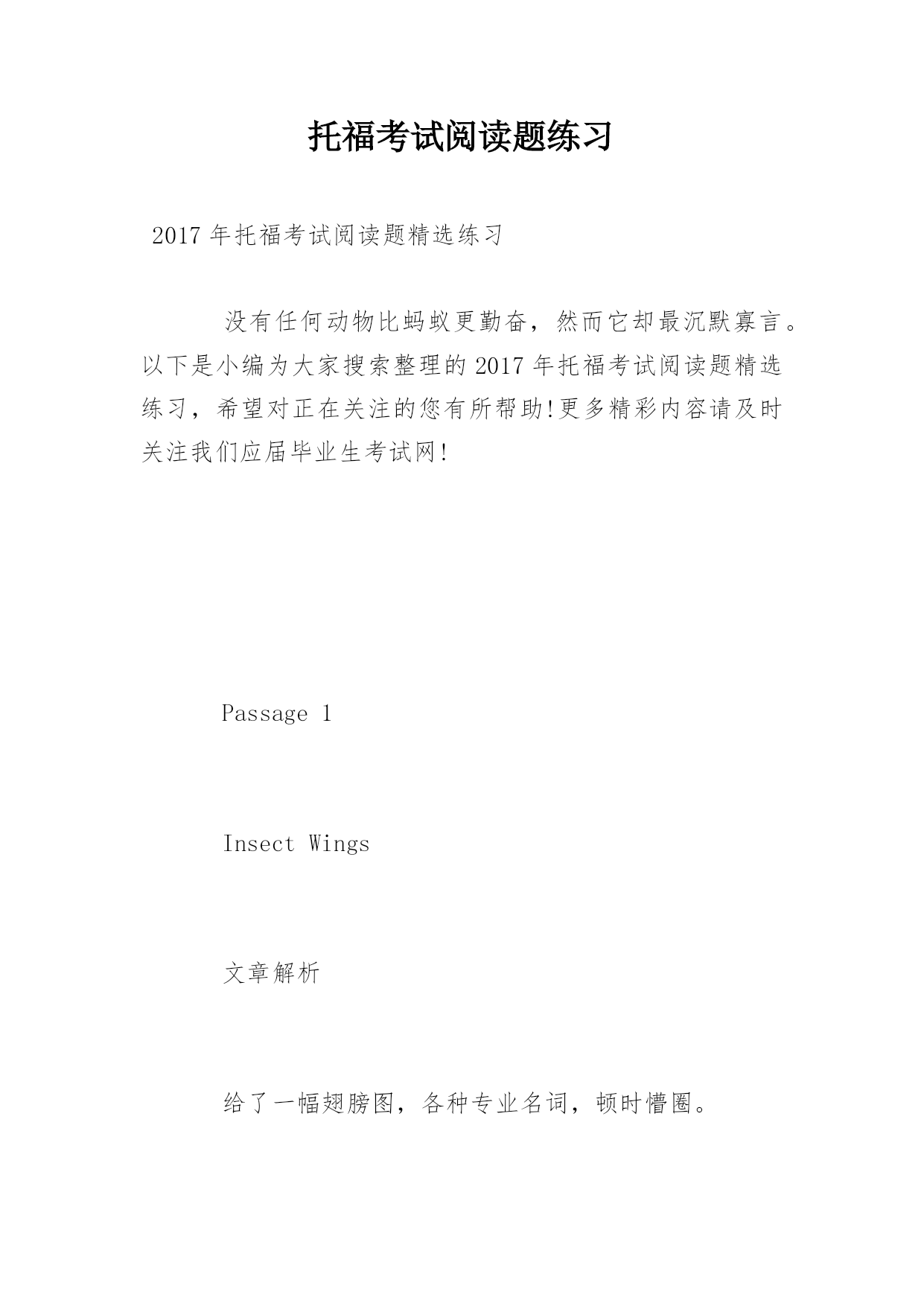 托福考试阅读题练习2017年托福考试阅读题精选练习没有任何动物比蚂蚁更勤奋,然而它却最沉默寡言。以下是小编为大家搜索整理的2017年托福考试阅读题精选练习,希望对正在关注的您有所帮助!更多精彩内容请及时关注我们应届毕业生考试网!Passage1InsectWings文章解析给了一幅翅膀图,各种专业名词,顿时懵圈。第一段:引入话题,翅膀化石fossil,引发很多猜测speculation。第二段:讲了原始翅膀protowings,提出了一个theory,讲了翅膀的作用。第三段:说第一个理论存在问题,prot