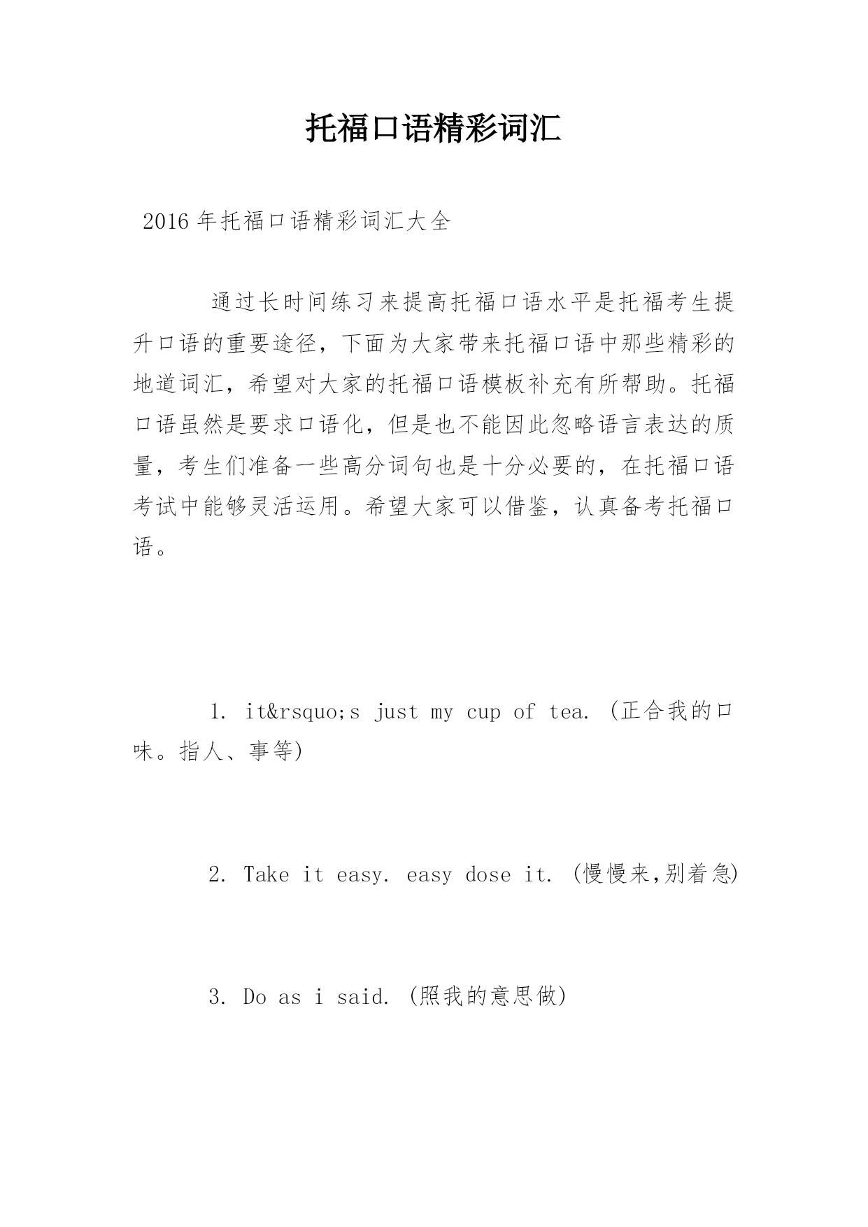 托福口语精彩词汇2016年托福口语精彩词汇大全通过长时间练习来提高托福口语水平是托福考生提升口语的重要途径,下面为大家带来托福口语中那些精彩的地道词汇,希望对大家的托福口语模板补充有所帮助。托福口语虽然是要求口语化,但是也不能因此忽略语言表达的质量,考生们准备一些高分词句也是十分必要的,在托福口语考试中能够灵活运用。希望大家可以借鉴,认真备考托福口语。1.it’sjustmycupoftea.(正合我的口味。指人、事等)2.Takeiteasy.easydoseit.(慢慢来,别着急)3.Do