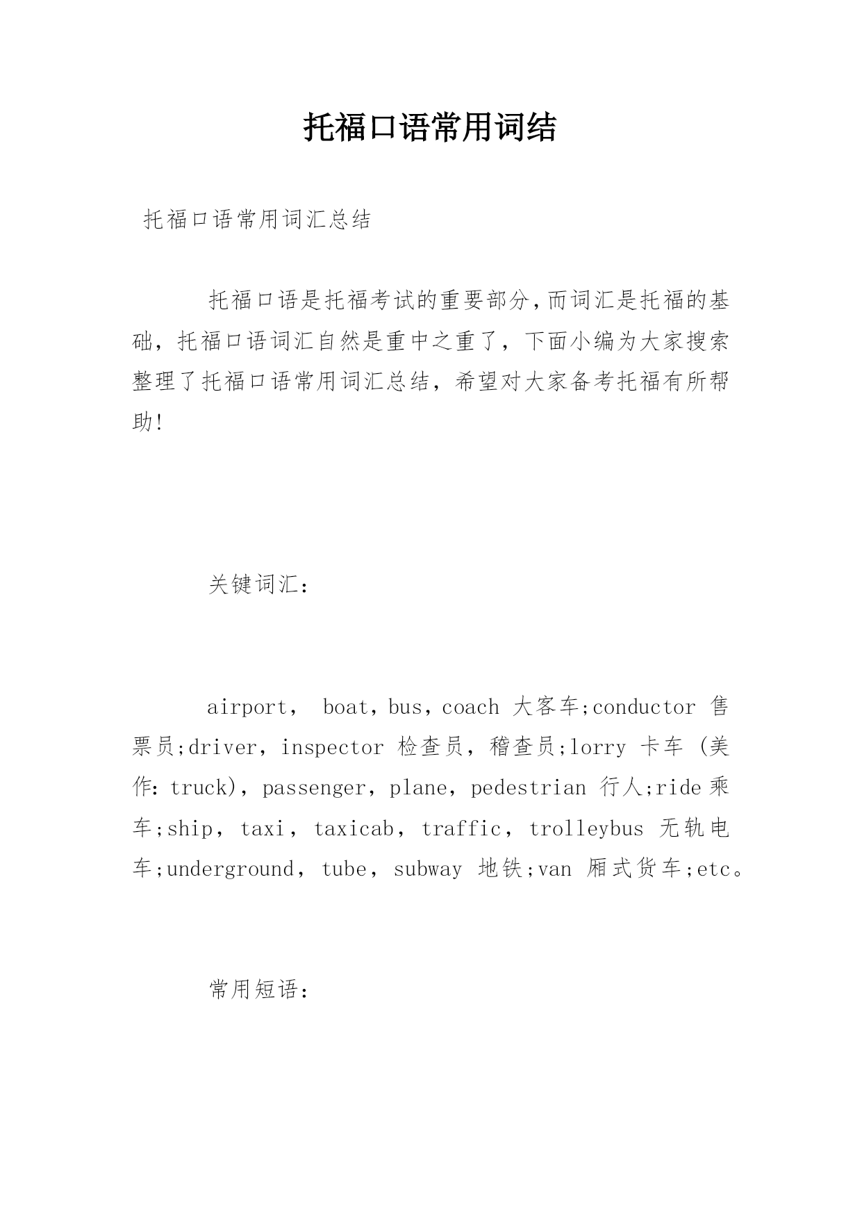 托福口语常用词结托福口语常用词汇总结托福口语是托福考试的重要部分,而词汇是托福的基础,托福口语词汇自然是重中之重了,下面小编为大家搜索整理了托福口语常用词汇总结,希望对大家备考托福有所帮助!关键词汇:airport,boat,bus,coach大客车;conductor售票员;driver,inspector检查员,稽查员;lorry卡车(美作:truck),passenger,plane,pedestrian行人;ride乘车;ship,taxi,taxicab,traffic,trolleybus无轨