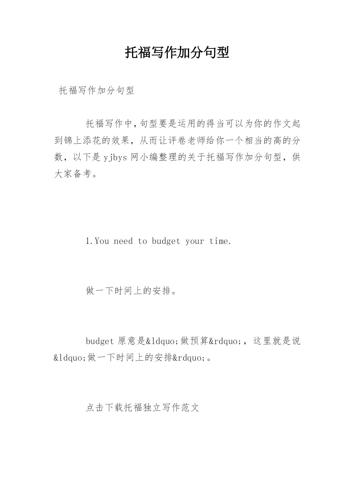 托福写作加分句型托福写作加分句型托福写作中,句型要是运用的得当可以为你的作文起到锦上添花的效果,从而让评卷老师给你一个相当的高的分数,以下是yjbys网小编整理的关于托福写作加分句型,供大家备考。1.Youneedtobudgetyourtime.做一下时间上的安排。budget原意是“做预算”,这里就是说“做一下时间上的安排”。点击下载托福独立写作范文2.Putasidesometimeforpingpong.预留一些时间。putaside原先和money