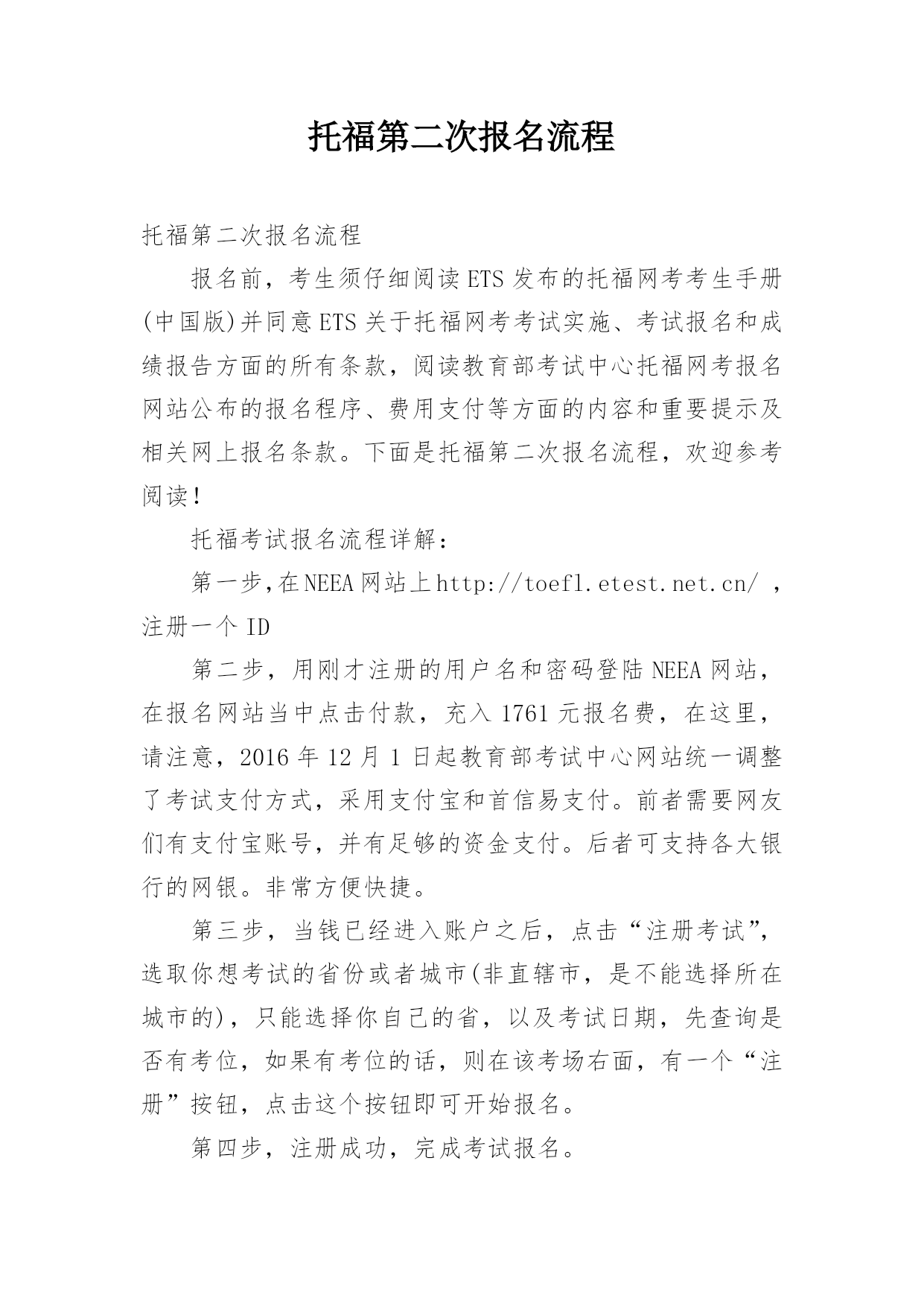 托福第二次报名流程托福第二次报名流程报名前,考生须仔细阅读ETS发布的托福网考考生手册(中国版)并同意ETS关于托福网考考试实施、考试报名和成绩报告方面的所有条款,阅读教育部考试中心托福网考报名网站公布的报名程序、费用支付等方面的内容和重要提示及相关网上报名条款。下面是托福第二次报名流程,欢迎参考阅读!托福考试报名流程详解:第一步,在NEEA网站上http://toefl.etest.net.cn/,注册一个ID第二步,用刚才注册的用户名和密码登陆NEEA网站,在报名网站当中点击付款,充入1761元报名费