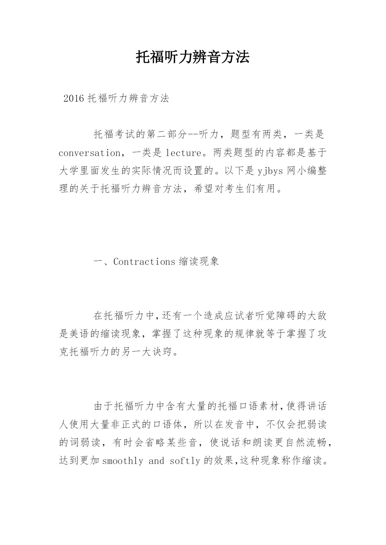 托福听力辨音方法2016托福听力辨音方法托福考试的第二部分--听力,题型有两类,一类是conversation,一类是lecture。两类题型的内容都是基于大学里面发生的实际情况而设置的。以下是yjbys网小编整理的关于托福听力辨音方法,希望对考生们有用。一、Contractions缩读现象在托福听力中,还有一个造成应试者听觉障碍的大敌是美语的缩读现象,掌握了这种现象的规律就等于掌握了攻克托福听力的另一大诀窍。由于托福听力中含有大量的托福口语素材,使得讲话人使用大量非正式的口语体,所以在发音中,不仅会把弱