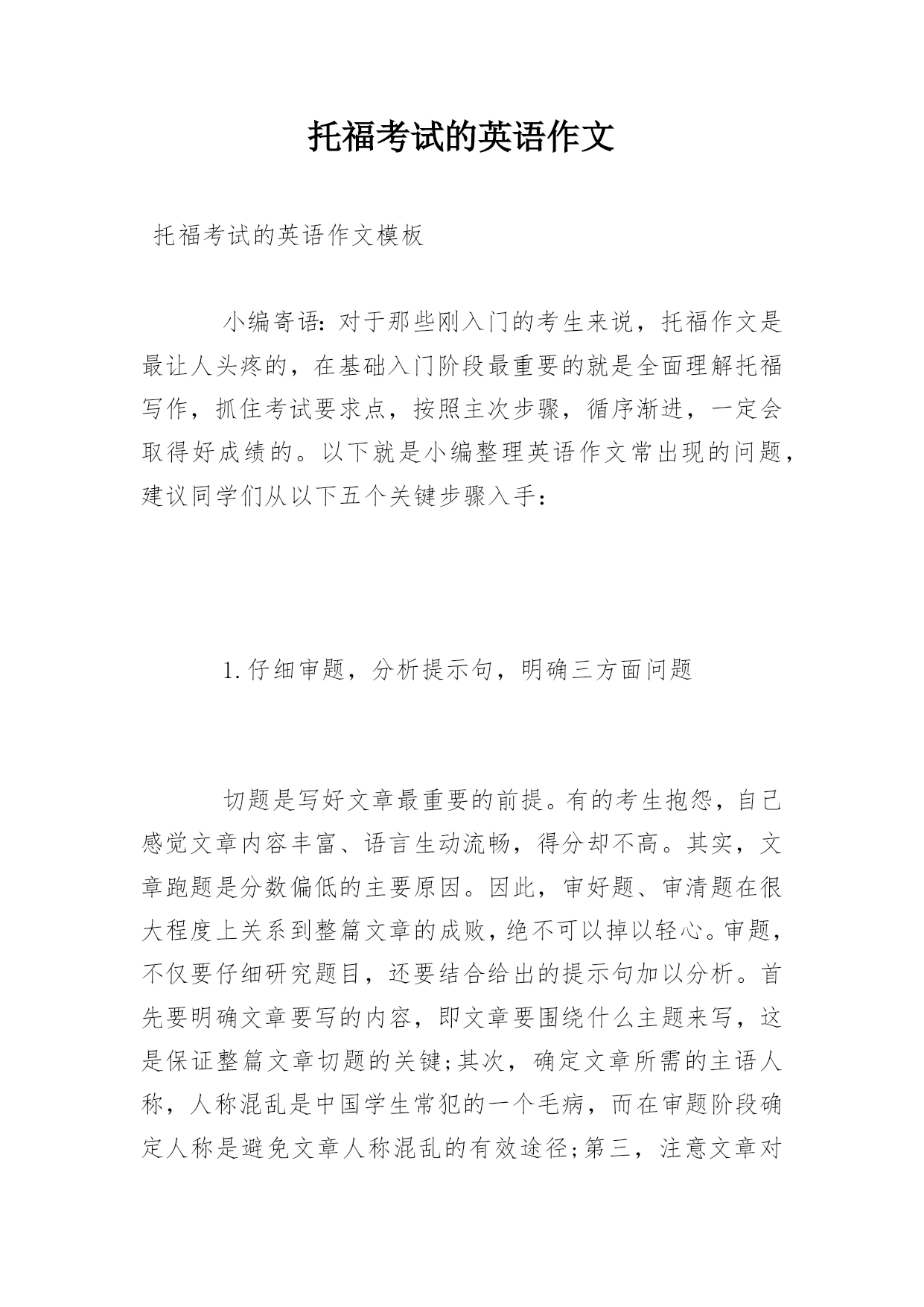 托福考试的英语作文托福考试的英语作文模板小编寄语:对于那些刚入门的考生来说,托福作文是最让人头疼的,在基础入门阶段最重要的就是全面理解托福写作,抓住考试要求点,按照主次步骤,循序渐进,一定会取得好成绩的。以下就是小编整理英语作文常出现的问题,建议同学们从以下五个关键步骤入手:1.仔细审题,分析提示句,明确三方面问题切题是写好文章最重要的前提。有的考生抱怨,自己感觉文章内容丰富、语言生动流畅,得分却不高。其实,文章跑题是分数偏低的主要原因。因此,审好题、审清题在很大程度上关系到整篇文章的成败,绝不可以掉以轻