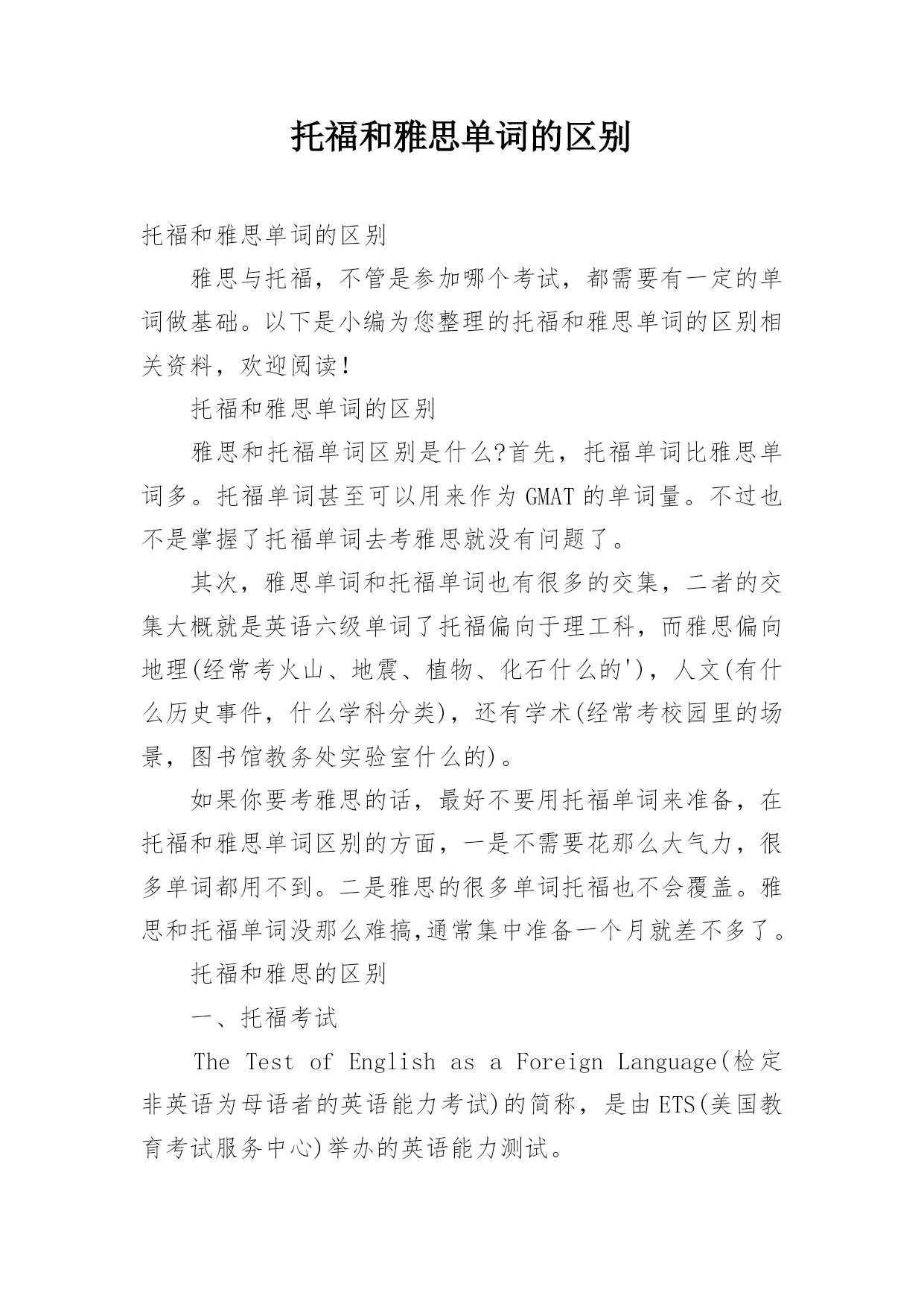 托福和雅思单词的区别托福和雅思单词的区别雅思与托福,不管是参加哪个考试,都需要有一定的单词做基础。以下是小编为您整理的托福和雅思单词的区别相关资料,欢迎阅读!托福和雅思单词的区别雅思和托福单词区别是什么?首先,托福单词比雅思单词多。托福单词甚至可以用来作为GMAT的单词量。不过也不是掌握了托福单词去考雅思就没有问题了。其次,雅思单词和托福单词也有很多的交集,二者的交集大概就是英语六级单词了托福偏向于理工科,而雅思偏向地理(经常考火山、地震、植物、化石什么的'),人文(有什么历史事件,什么学科分类),还有学