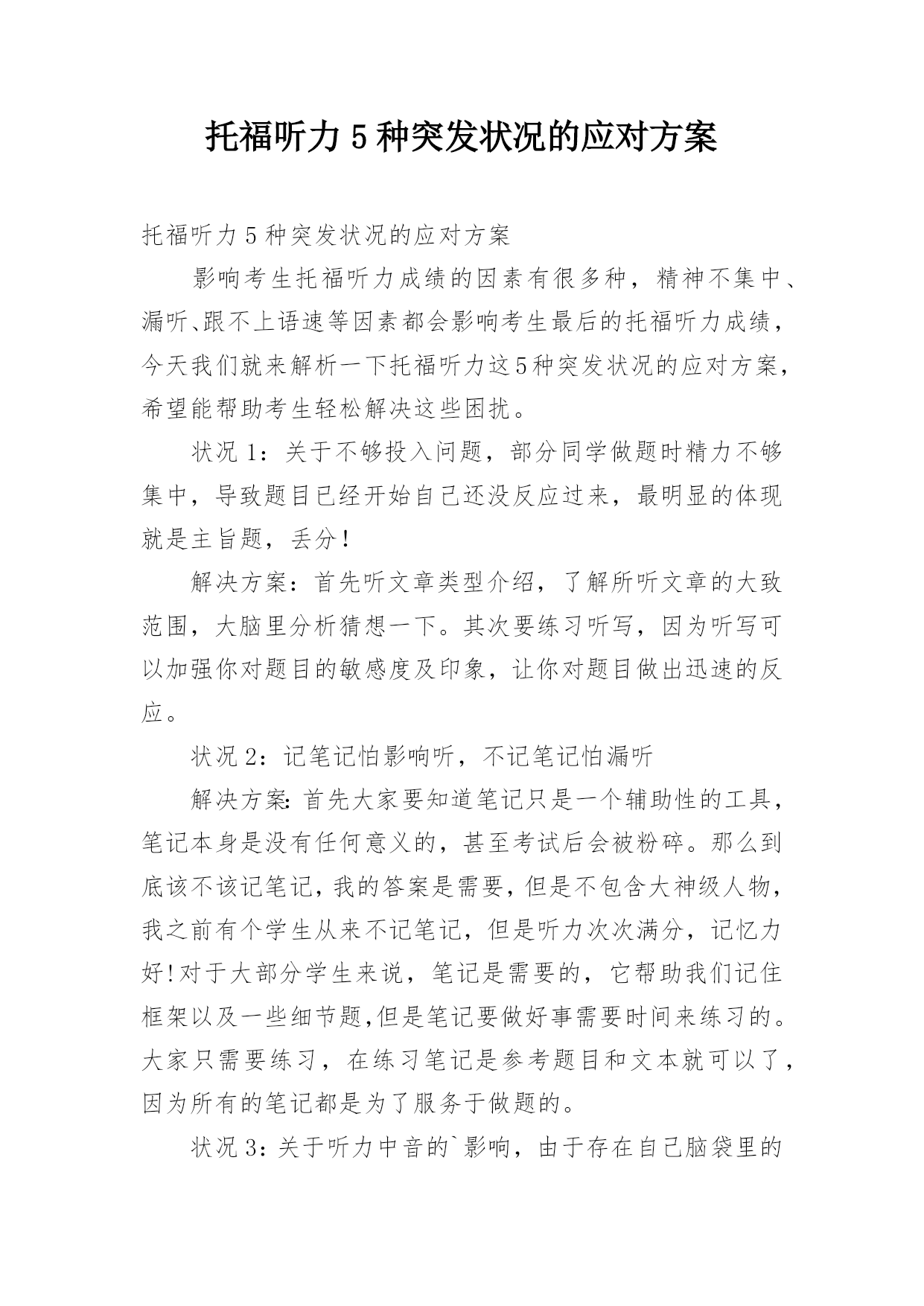托福听力5种突发状况的应对方案托福听力5种突发状况的应对方案影响考生托福听力成绩的因素有很多种,精神不集中、漏听、跟不上语速等因素都会影响考生最后的托福听力成绩,今天我们就来解析一下托福听力这5种突发状况的应对方案,希望能帮助考生轻松解决这些困扰。状况1:关于不够投入问题,部分同学做题时精力不够集中,导致题目已经开始自己还没反应过来,最明显的体现就是主旨题,丢分!解决方案:首先听文章类型介绍,了解所听文章的大致范围,大脑里分析猜想一下。其次要练习听写,因为听写可以加强你对题目的敏感度及印象,让你对题目做出