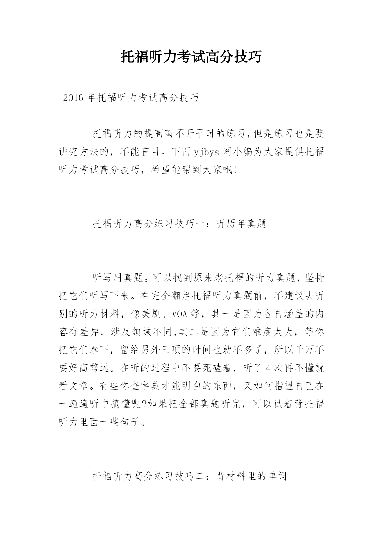 托福听力考试高分技巧2016年托福听力考试高分技巧托福听力的提高离不开平时的练习,但是练习也是要讲究方法的,不能盲目。下面yjbys网小编为大家提供托福听力考试高分技巧,希望能帮到大家哦!托福听力高分练习技巧一:听历年真题听写用真题。可以找到原来老托福的听力真题,坚持把它们听写下来。在完全翻烂托福听力真题前,不建议去听别的听力材料,像美剧、VOA等,其一是因为各自涵盖的内容有差异,涉及领域不同;其二是因为它们难度太大,等你把它们拿下,留给另外三项的时间也就不多了,所以千万不要好高骛远。在听的过程中不要死磕