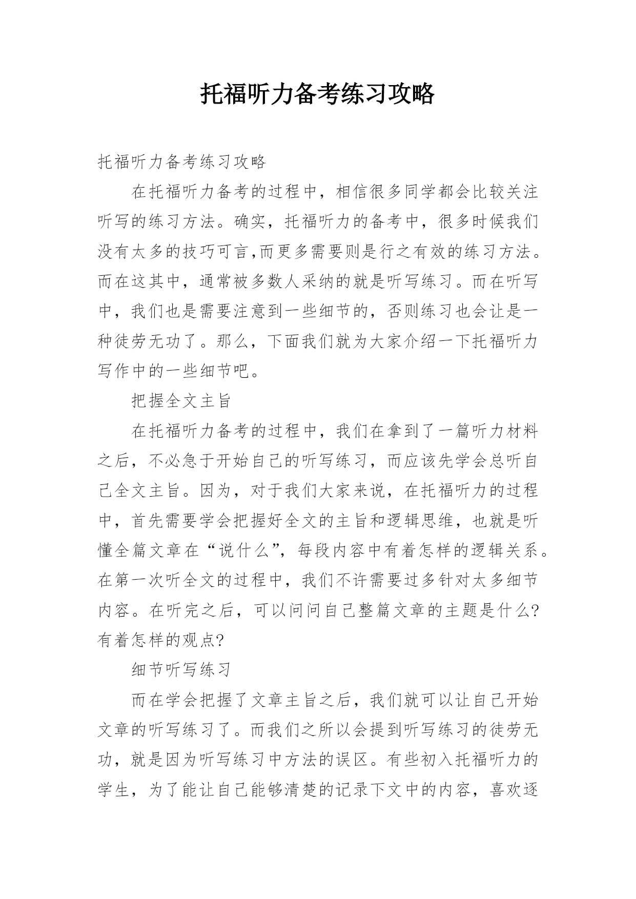 托福听力备考练习攻略托福听力备考练习攻略在托福听力备考的过程中,相信很多同学都会比较关注听写的练习方法。确实,托福听力的备考中,很多时候我们没有太多的技巧可言,而更多需要则是行之有效的练习方法。而在这其中,通常被多数人采纳的就是听写练习。而在听写中,我们也是需要注意到一些细节的,否则练习也会让是一种徒劳无功了。那么,下面我们就为大家介绍一下托福听力写作中的一些细节吧。把握全文主旨在托福听力备考的过程中,我们在拿到了一篇听力材料之后,不必急于开始自己的听写练习,而应该先学会总听自己全文主旨。因为,对于我们大
