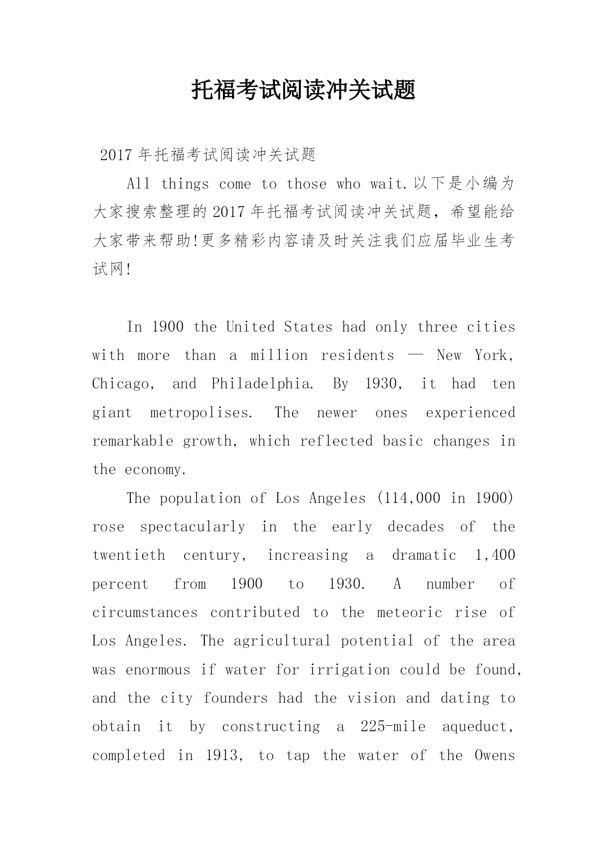 托福考试阅读冲关试题2017年托福考试阅读冲关试题Allthingscometothosewhowait.以下是小编为大家搜索整理的2017年托福考试阅读冲关试题,希望能给大家带来帮助!更多精彩内容请及时关注我们应届毕业生考试网!In1900theUnitedStateshadonlythreecitieswithmorethanamillionresidents—NewYork,Chicago,andPhiladelphia.By1930,ithadtengiantmetropolises.Thenew