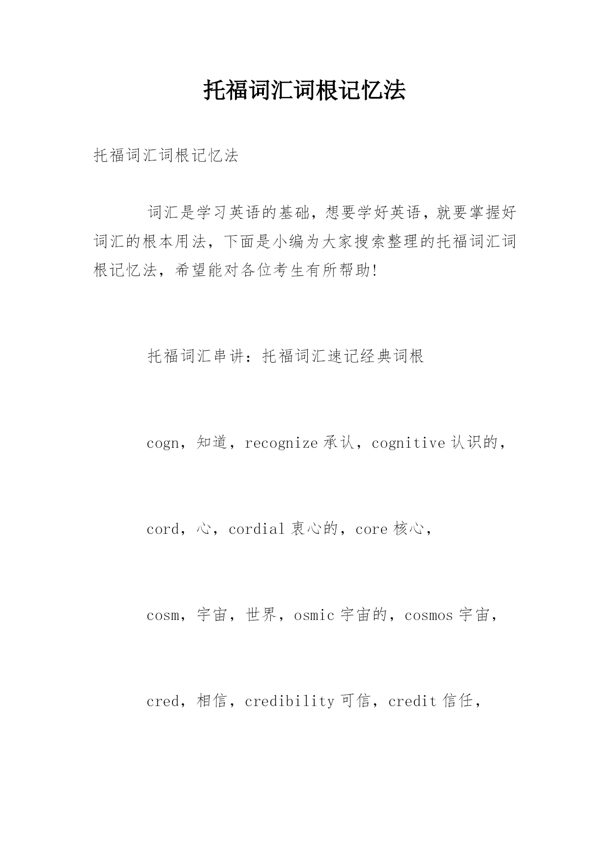 托福词汇词根记忆法托福词汇词根记忆法词汇是学习英语的基础,想要学好英语,就要掌握好词汇的根本用法,下面是小编为大家搜索整理的托福词汇词根记忆法,希望能对各位考生有所帮助!托福词汇串讲:托福词汇速记经典词根cogn,知道,recognize承认,cognitive认识的,cord,心,cordial衷心的,core核心,cosm,宇宙,世界,osmic宇宙的,cosmos宇宙,cred,相信,credibility可信,credit信任,cur,cours,跑,ccurrence出现,发生,current流