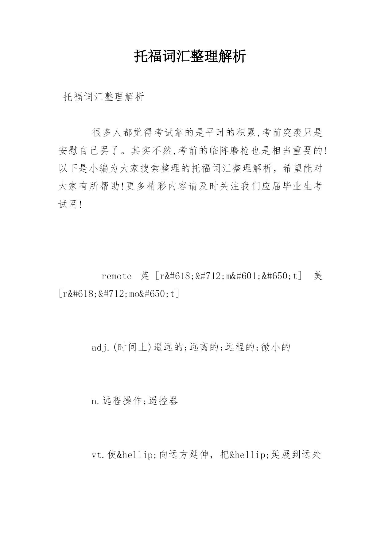 托福词汇整理解析托福词汇整理解析很多人都觉得考试靠的是平时的积累,考前突袭只是安慰自己罢了。其实不然,考前的临阵磨枪也是相当重要的!以下是小编为大家搜索整理的托福词汇整理解析,希望能对大家有所帮助!更多精彩内容请及时关注我们应届毕业生考试网!remote英[rɪˈməʊt]美[rɪˈmoʊt]adj.(时间上)遥远的;远离的;远程的;微小的n.远程操作;遥控器vt.使…向远方延伸,把…延展到远处远程;远程遥控