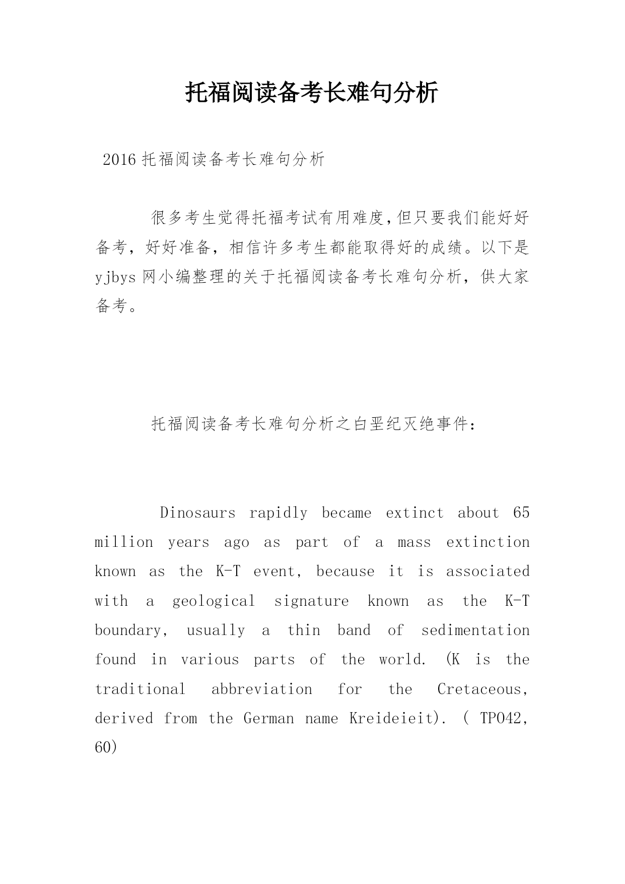 托福阅读备考长难句分析2016托福阅读备考长难句分析很多考生觉得托福考试有用难度,但只要我们能好好备考,好好准备,相信许多考生都能取得好的成绩。以下是yjbys网小编整理的关于托福阅读备考长难句分析,供大家备考。托福阅读备考长难句分析之白垩纪灭绝事件:Dinosaursrapidlybecameextinctabout65millionyearsagoaspartofamassextinctionknownastheK-Tevent,becauseitisassociatedwithageological