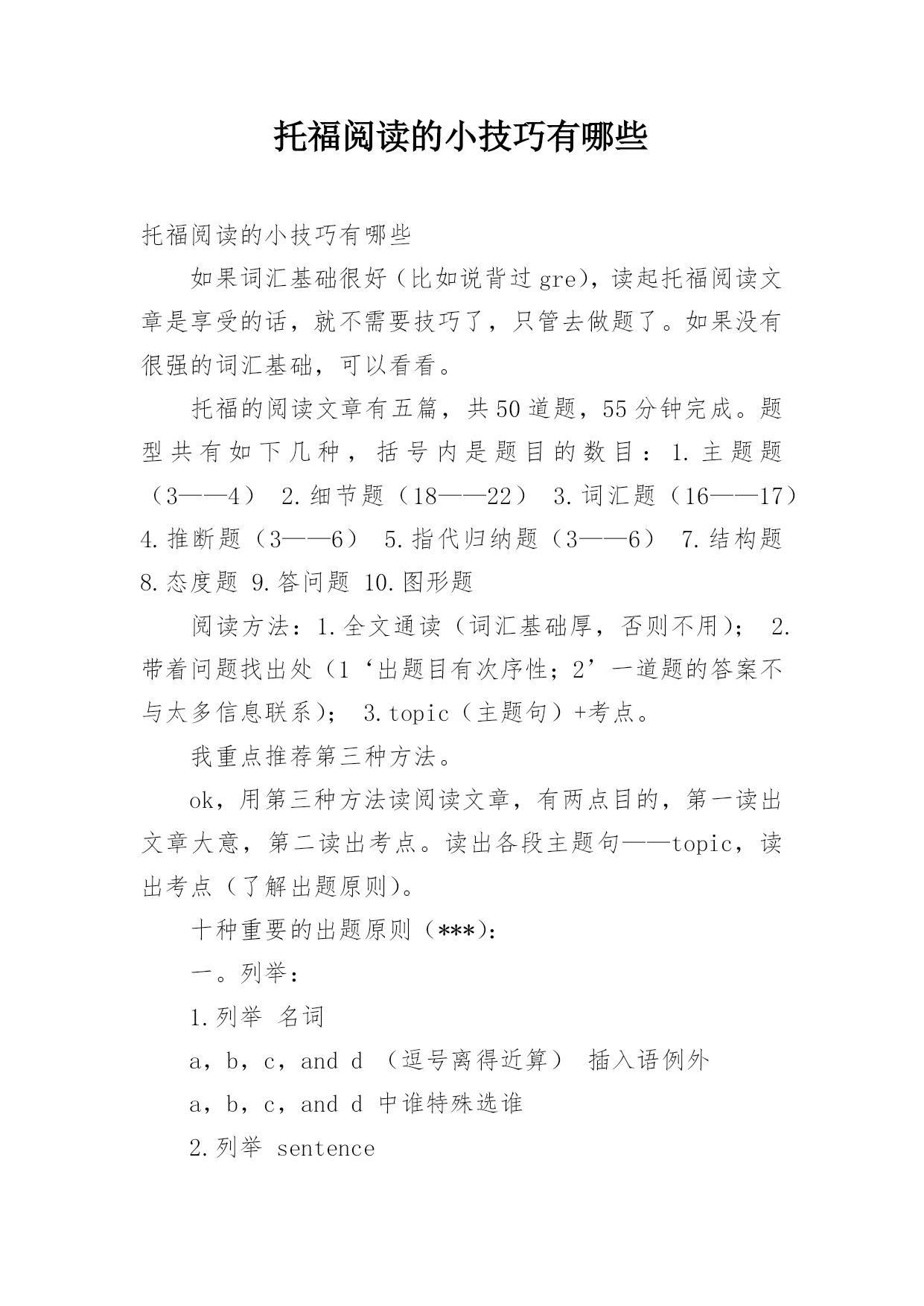 托福阅读的小技巧有哪些托福阅读的小技巧有哪些如果词汇基础很好(比如说背过gre),读起托福阅读文章是享受的话,就不需要技巧了,只管去做题了。如果没有很强的词汇基础,可以看看。托福的阅读文章有五篇,共50道题,55分钟完成。题型共有如下几种,括号内是题目的数目:1.主题题(3——4)2.细节题(18——22)3.词汇题(16——17)4.推断题(3——6)5.指代归纳题(3——6)7.结构题8.态度题9.答问题10.图形题阅读方法:1.全文通读(词汇基础厚,否则不用);2.带着问题找出处(1‘出题目有次序性