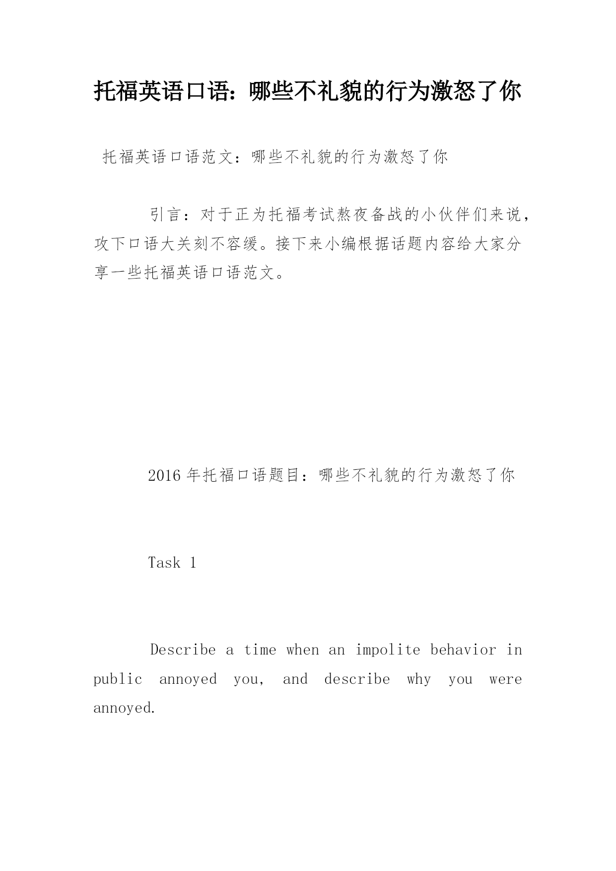托福英语口语:哪些不礼貌的行为激怒了你托福英语口语范文:哪些不礼貌的行为激怒了你引言:对于正为托福考试熬夜备战的小伙伴们来说,攻下口语大关刻不容缓。接下来小编根据话题内容给大家分享一些托福英语口语范文。2016年托福口语题目:哪些不礼貌的行为激怒了你Task1Describeatimewhenanimpolitebehaviorinpublicannoyedyou,anddescribewhyyouwereannoyed.Sometimespeoplebehaveimpolitelyinpublic.De