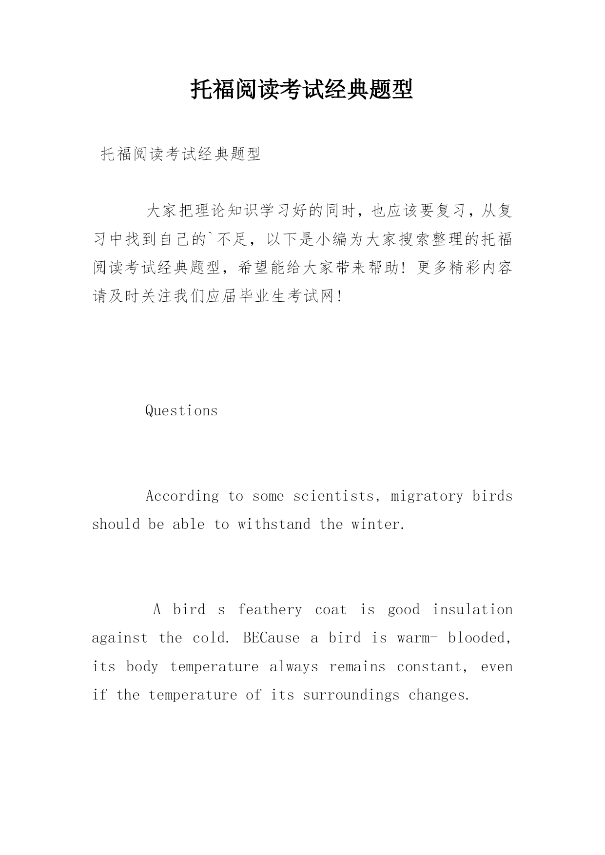 托福阅读考试经典题型托福阅读考试经典题型大家把理论知识学习好的同时,也应该要复习,从复习中找到自己的`不足,以下是小编为大家搜索整理的托福阅读考试经典题型,希望能给大家带来帮助!更多精彩内容请及时关注我们应届毕业生考试网!QuestionsAccordingtosomescientists,migratorybirdsshouldbeabletowithstandthewinter.Abirdsfeatherycoatisgoodinsulationagainstthecold.BECauseabirdi