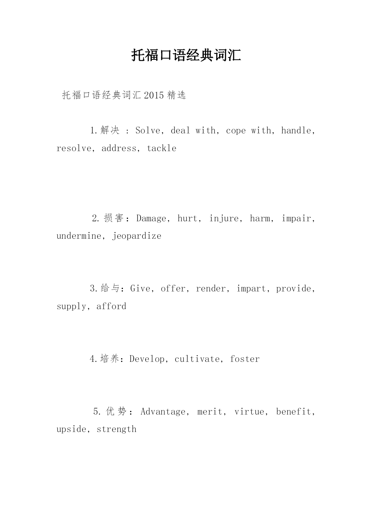 托福口语经典词汇托福口语经典词汇2015精选1.解决:Solve,dealwith,copewith,handle,resolve,address,tackle2.损害:Damage,hurt,injure,harm,impair,undermine,jeopardize3.给与:Give,offer,render,impart,provide,supply,afford4.培养:Develop,cultivate,foster5.优势:Advantage,merit,virtue,benefit,ups