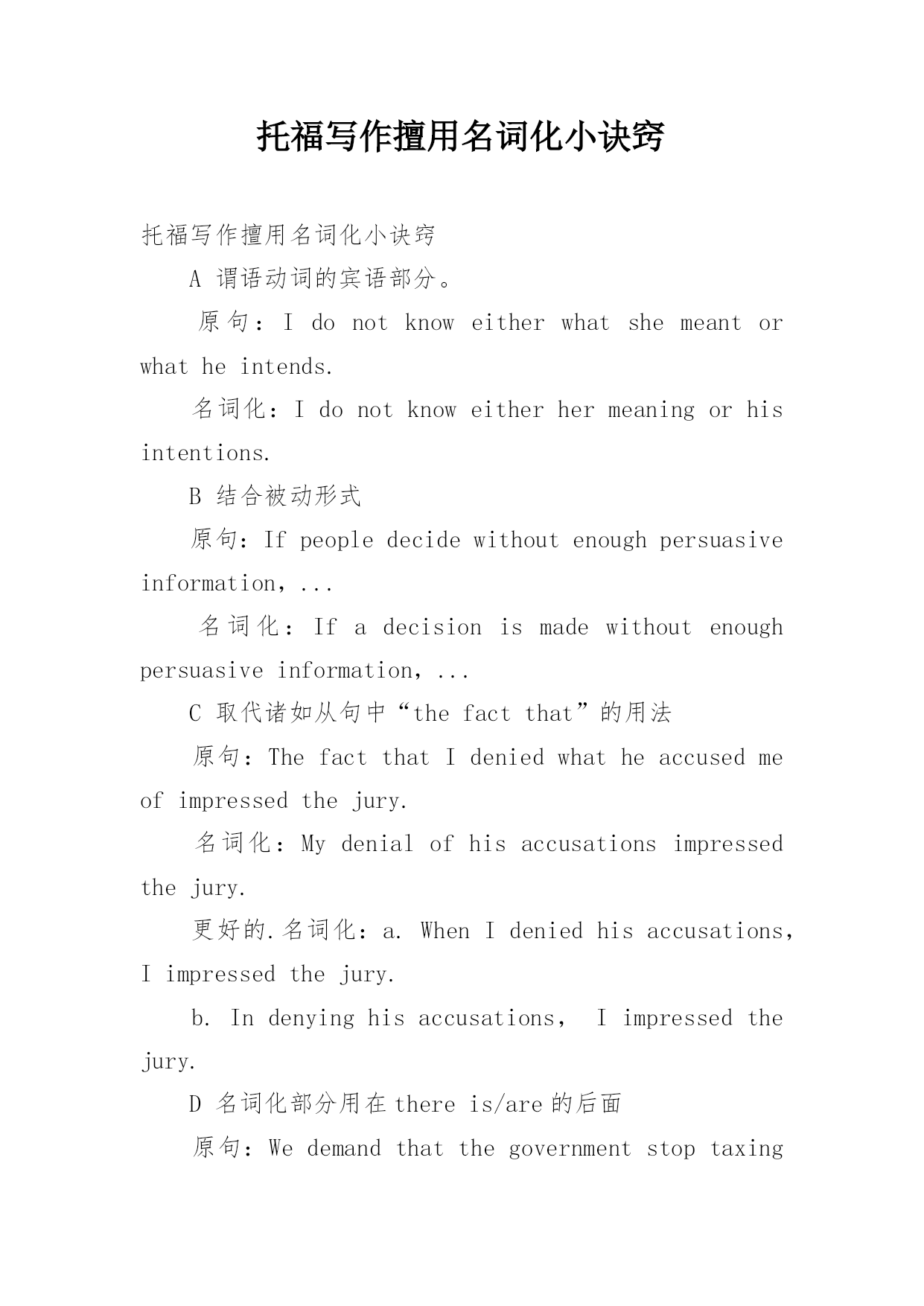 托福写作擅用名词化小诀窍托福写作擅用名词化小诀窍A谓语动词的宾语部分。原句:Idonotknoweitherwhatshemeantorwhatheintends.名词化:Idonotknoweitherhermeaningorhisintentions.B结合被动形式原句:Ifpeopledecidewithoutenoughpersuasiveinformation,...名词化:Ifadecisionismadewithoutenoughpersuasiveinformation,...C取代诸如从