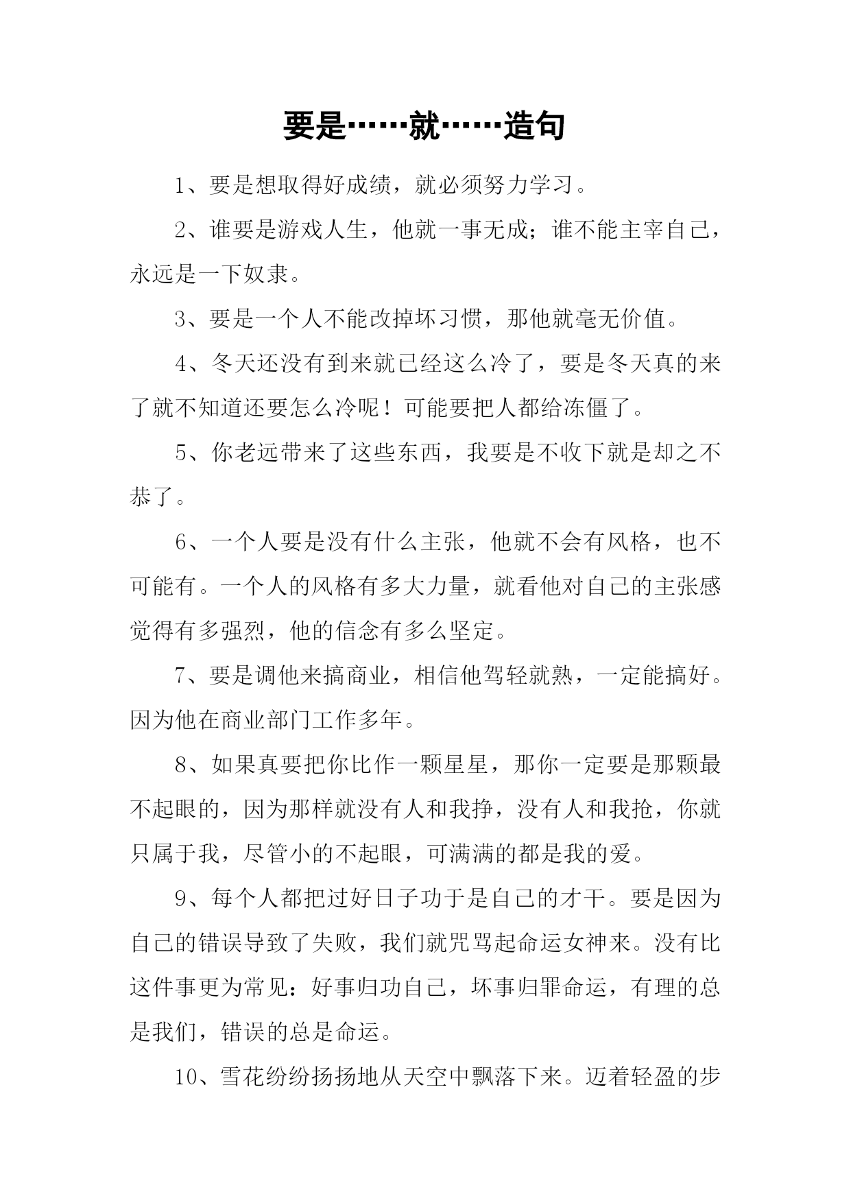 要是……就……造句1、要是想取得好成绩,就必须努力学习。2、谁要是游戏人生,他就一事无成;谁不能主宰自己,永远是一下奴隶。3、要是一个人不能改掉坏习惯,那他就毫无价值。4、冬天还没有到来就已经这么冷了,要是冬天真的来了就不知道还要怎么冷呢!可能要把人都给冻僵了。5、你老远带来了这些东西,我要是不收下就是却之不恭了。6、一个人要是没有什么主张,他就不会有风格,也不可能有。一个人的风格有多大力量,就看他对自己的主张感觉得有多强烈,他的信念有多么坚定。7、要是调他来搞商业,相信他驾轻就熟,一定能搞好。因为他在商