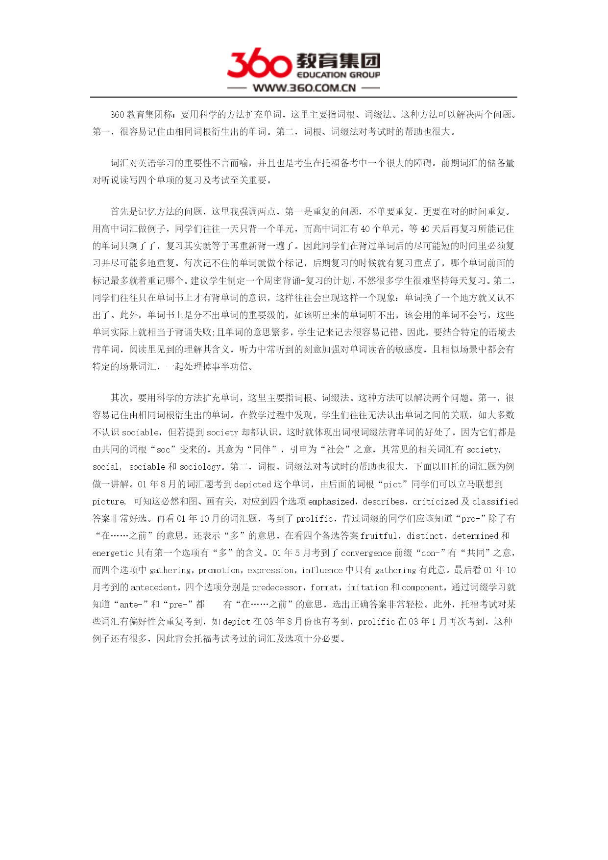 360教育集团称:要用科学的方法扩充单词,这里主要指词根、词缀法。这种方法可以解决两个问题。第一,很容易记住由相同词根衍生出的单词。第二,词根、词缀法对考试时的帮助也很大。词汇对英语学习的重要性不言而喻,并且也是考生在托福备考中一个很大的障碍。前期词汇的储备量对听说读写四个单项的复习及考试至关重要。首先是记忆方法的问题,这里我强调两点,第一是重复的问题,不单要重复,更要在对的时间重复。用高中词汇做例子,同学们往往一天只背一个单元,而高中词汇有40个单元,等40天后再复习所能记住的单词只剩了了,复习其实就等