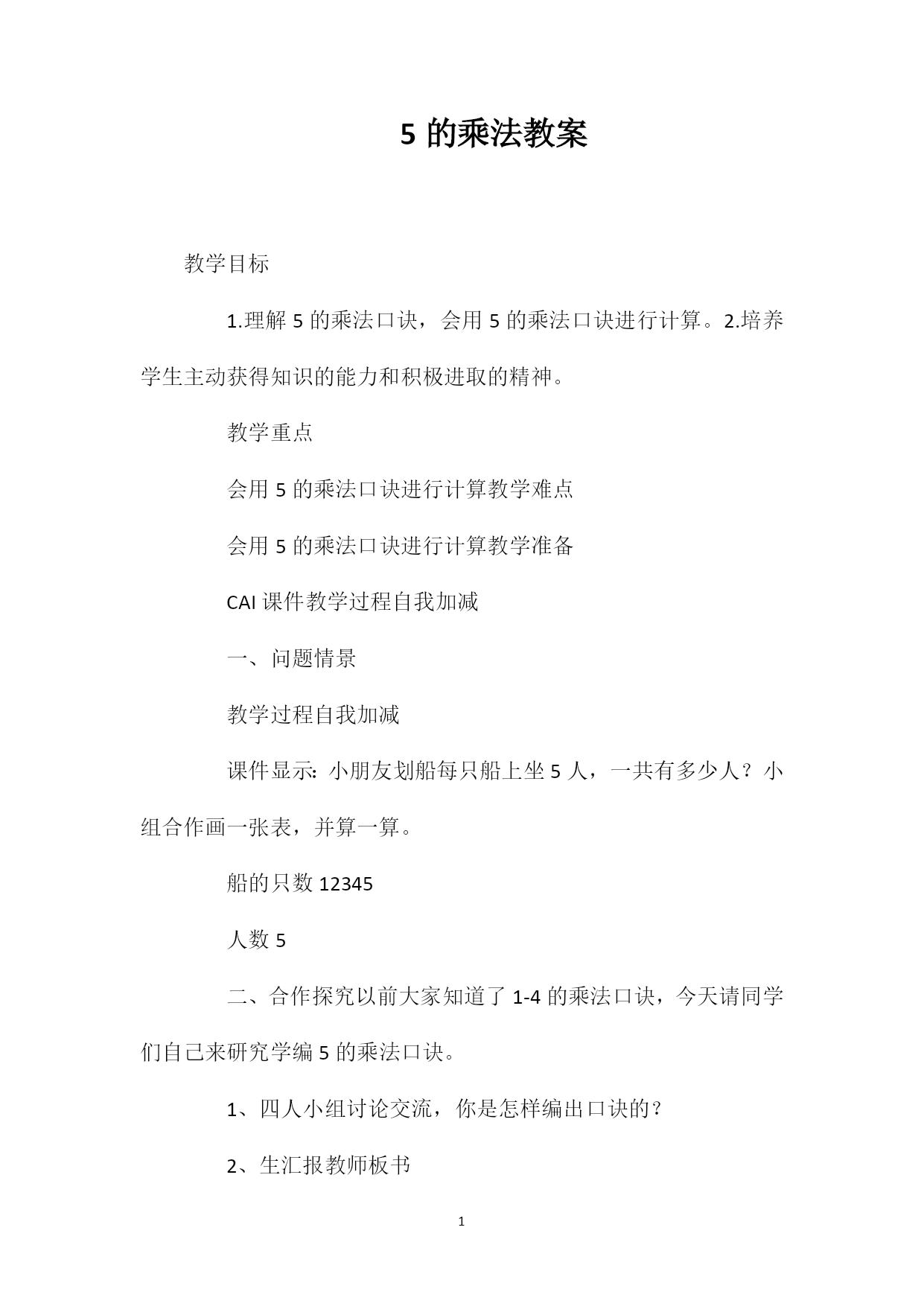 5的乘法教案教学目标1.理解5的乘法口诀,会用5的乘法口诀进行计算。2.培养学生主动获得知识的能力和积极进取的精神。教学重点会用5的乘法口诀进行计算教学难点会用5的乘法口诀进行计算教学准备CAI课件教学过程自我加减一、问题情景教学过程自我加减课件显示:小朋友划船每只船上坐5人,一共有多少人?小组合作画一张表,并算一算。船的只数12345人数5二、合作探究以前大家知道了1-4的乘法口诀,今天请同学们自己来研究学编5的乘法口诀。1、四人小组讨论交流,你是怎样编出口诀的?2、生汇报教师板书1个5是55times