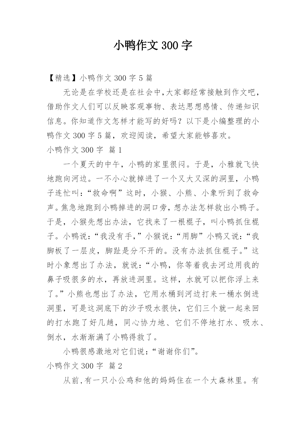 小鸭作文300字【精选】小鸭作文300字5篇无论是在学校还是在社会中,大家都经常接触到作文吧,借助作文人们可以反映客观事物、表达思想感情、传递知识信息。你知道作文怎样才能写的好吗?以下是小编整理的小鸭作文300字5篇,欢迎阅读,希望大家能够喜欢。小鸭作文300字篇1一个夏天的中午,小鸭的家里很闷。于是,小雅就飞快地跑向河边。一不小心就掉进了一个又大又深的洞里,小鸭子连忙叫:“救命啊”这时,小猴、小熊、小象听到了救命声。焦急地跑到小鸭掉进的洞口旁,想办法怎样救出小鸭子。于是,小猴先想出办法,它找来了一根棍子