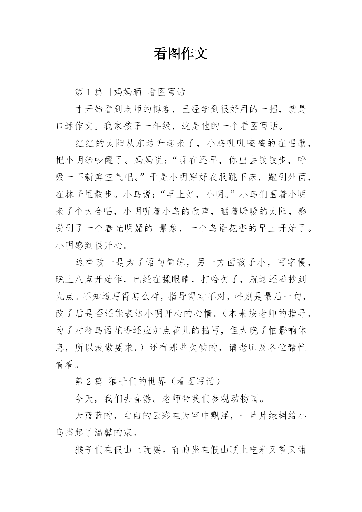 看图作文第1篇[妈妈晒]看图写话才开始看到老师的博客,已经学到很好用的一招,就是口述作文。我家孩子一年级,这是他的一个看图写话。红红的太阳从东边升起来了,小鸡叽叽喳喳的在唱歌,把小明给吵醒了。妈妈说:“现在还早,你出去散散步,呼吸一下新鲜空气吧。”于是小明穿好衣服跳下床,跑到外面,在林子里散步。小鸟说:“早上好,小明。”小鸟们围着小明来了个大合唱,小明听着小鸟的歌声,晒着暖暖的太阳,感受到了一个春光明媚的.景象,一个鸟语花香的早上开始了。小明感到很开心。这样改一是为了语句简练,另一方面孩子小,写字慢,晚上