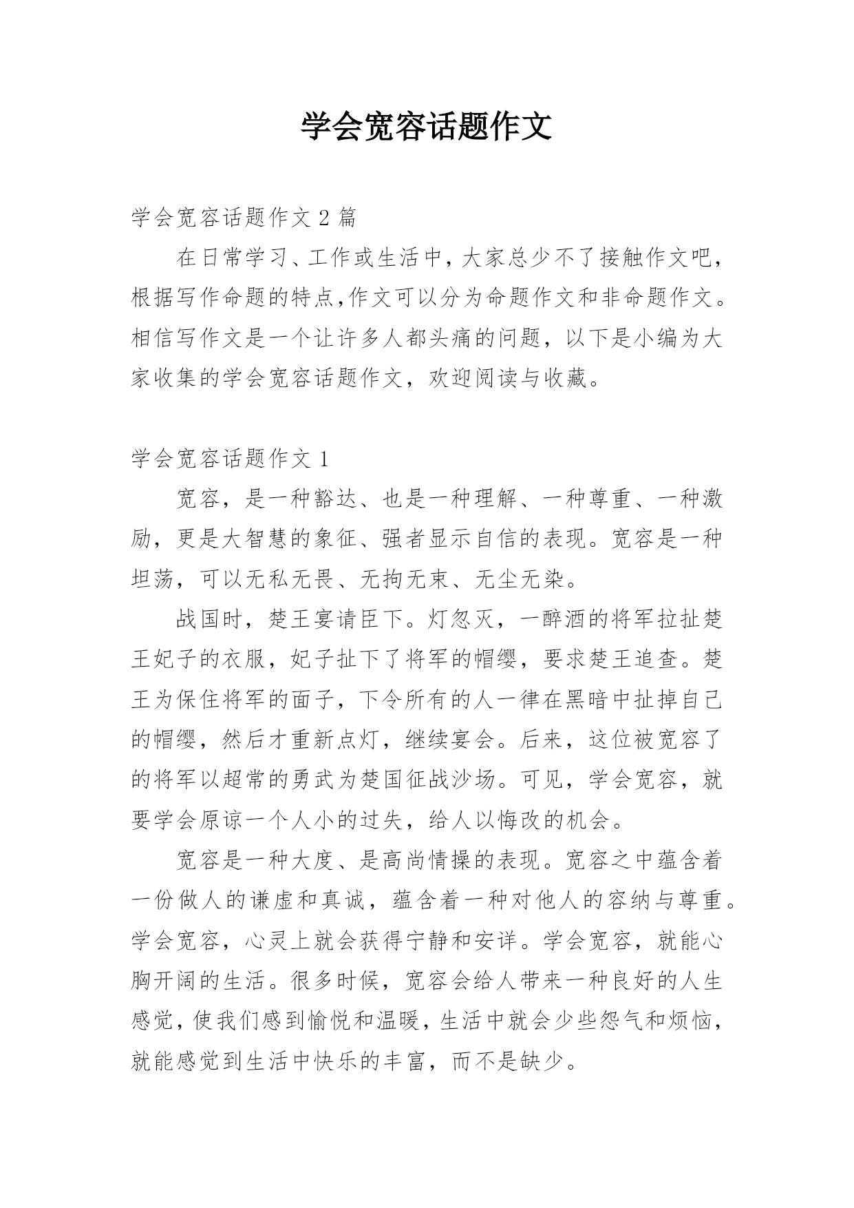 学会宽容话题作文学会宽容话题作文2篇在日常学习、工作或生活中,大家总少不了接触作文吧,根据写作命题的特点,作文可以分为命题作文和非命题作文。相信写作文是一个让许多人都头痛的问题,以下是小编为大家收集的学会宽容话题作文,欢迎阅读与收藏。学会宽容话题作文1宽容,是一种豁达、也是一种理解、一种尊重、一种激励,更是大智慧的象征、强者显示自信的表现。宽容是一种坦荡,可以无私无畏、无拘无束、无尘无染。战国时,楚王宴请臣下。灯忽灭,一醉酒的将军拉扯楚王妃子的衣服,妃子扯下了将军的帽缨,要求楚王追查。楚王为保住将军的面子