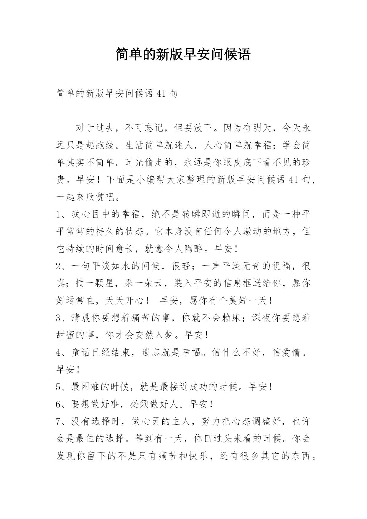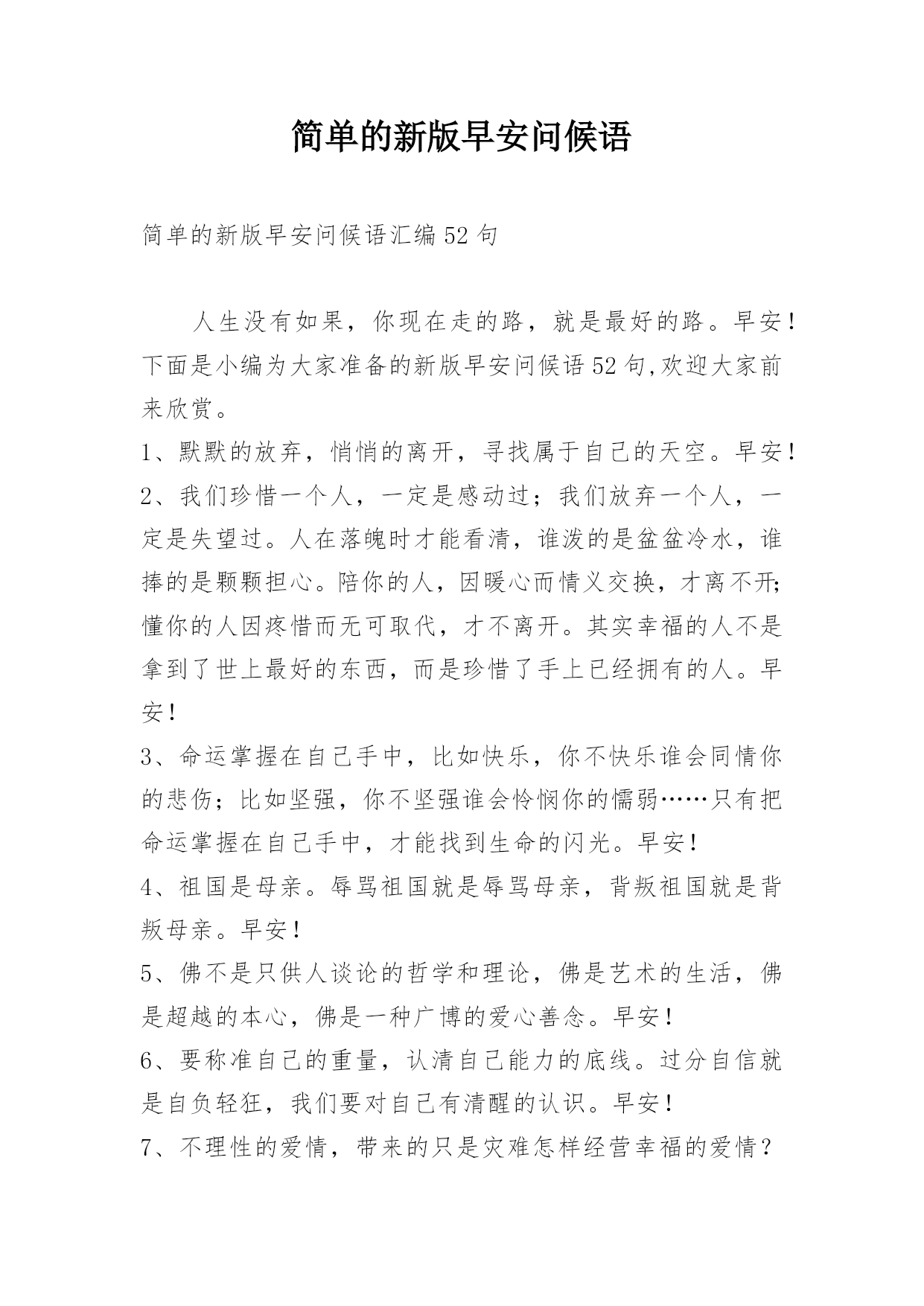简单的新版早安问候语简单的新版早安问候语汇编52句人生没有如果,你现在走的路,就是最好的路。早安!下面是小编为大家准备的新版早安问候语52句,欢迎大家前来欣赏。1、默默的放弃,悄悄的离开,寻找属于自己的天空。早安!2、我们珍惜一个人,一定是感动过;我们放弃一个人,一定是失望过。人在落魄时才能看清,谁泼的是盆盆冷水,谁捧的是颗颗担心。陪你的人,因暖心而情义交换,才离不开;懂你的人因疼惜而无可取代,才不离开。其实幸福的人不是拿到了世上最好的东西,而是珍惜了手上已经拥有的人。早安!3、命运掌握在自己手中,比如快