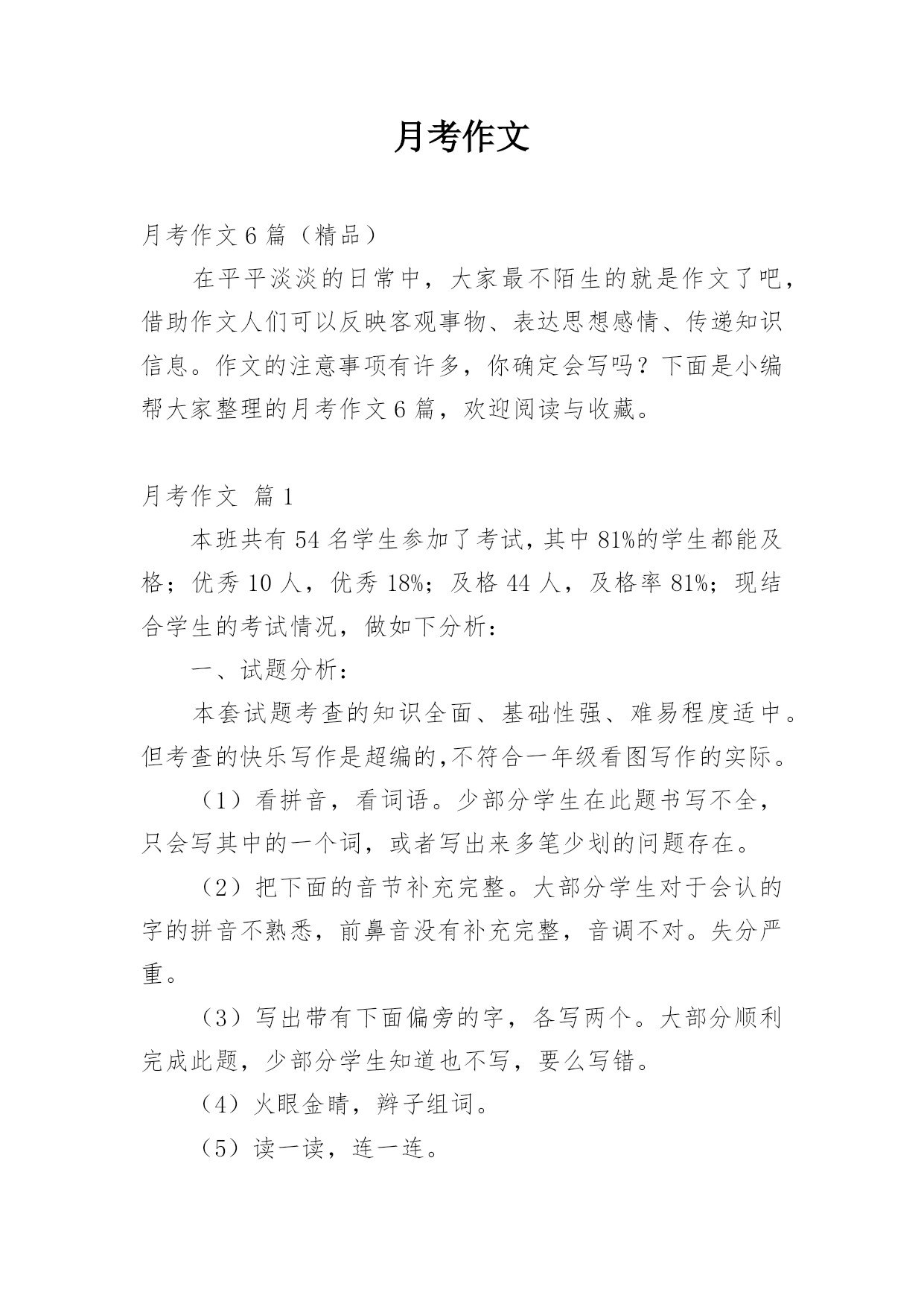 月考作文月考作文6篇(精品)在平平淡淡的日常中,大家最不陌生的就是作文了吧,借助作文人们可以反映客观事物、表达思想感情、传递知识信息。作文的注意事项有许多,你确定会写吗?下面是小编帮大家整理的月考作文6篇,欢迎阅读与收藏。月考作文篇1本班共有54名学生参加了考试,其中81%的学生都能及格;优秀10人,优秀18%;及格44人,及格率81%;现结合学生的考试情况,做如下分析:一、试题分析:本套试题考查的知识全面、基础性强、难易程度适中。但考查的快乐写作是超编的,不符合一年级看图写作的实际。(1)看拼音,看词语