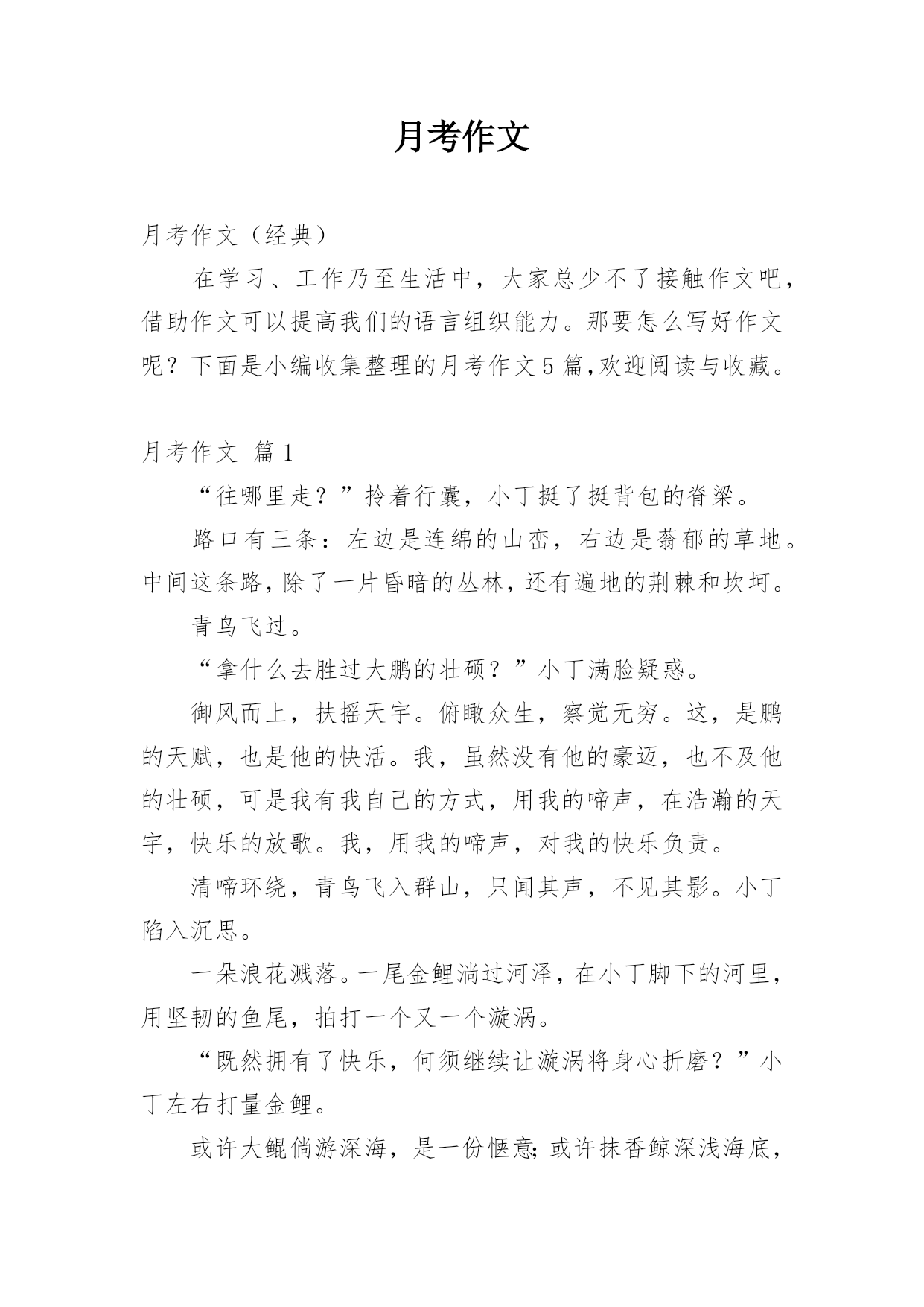 月考作文月考作文(经典)在学习、工作乃至生活中,大家总少不了接触作文吧,借助作文可以提高我们的语言组织能力。那要怎么写好作文呢?下面是小编收集整理的月考作文5篇,欢迎阅读与收藏。月考作文篇1“往哪里走?”拎着行囊,小丁挺了挺背包的脊梁。路口有三条:左边是连绵的山峦,右边是蓊郁的草地。中间这条路,除了一片昏暗的丛林,还有遍地的荆棘和坎坷。青鸟飞过。“拿什么去胜过大鹏的壮硕?”小丁满脸疑惑。御风而上,扶摇天宇。俯瞰众生,察觉无穷。这,是鹏的天赋,也是他的快活。我,虽然没有他的豪迈,也不及他的壮硕,可是我有我自