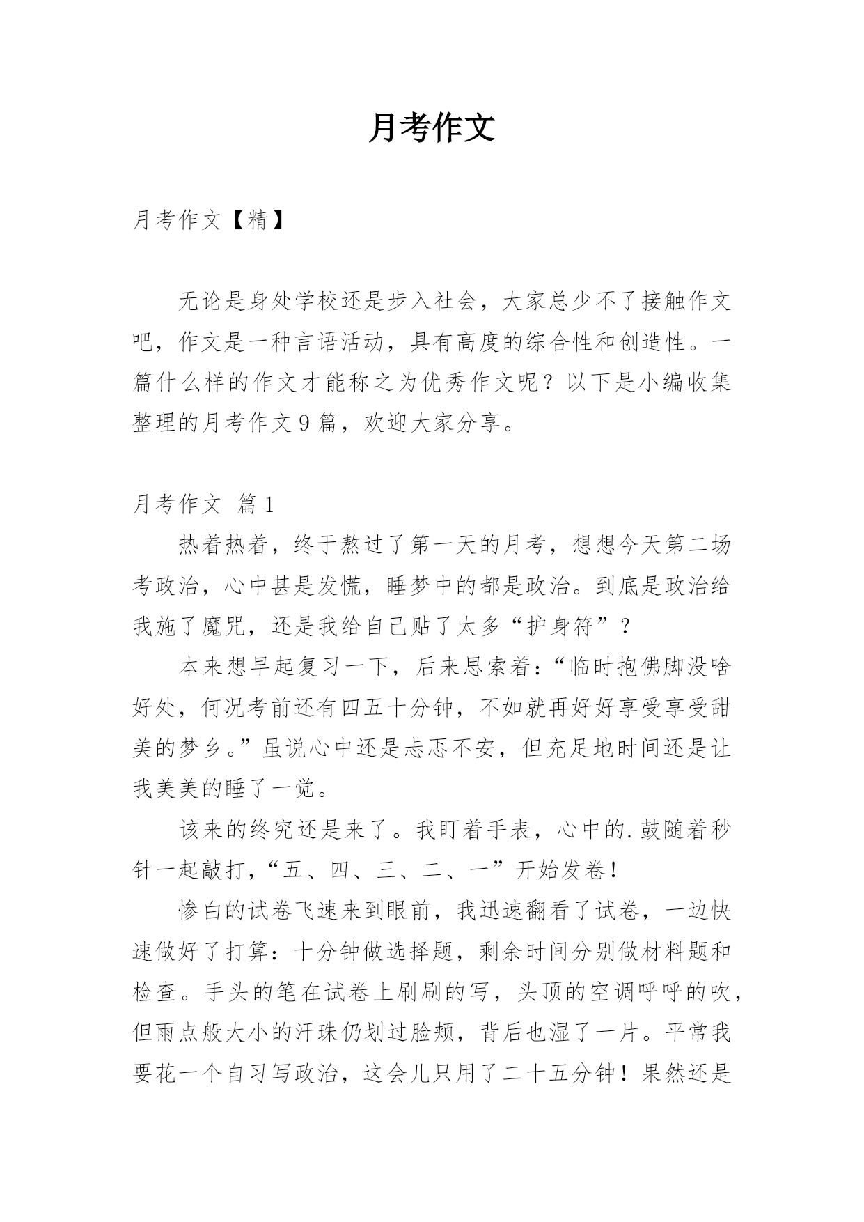 月考作文月考作文【精】无论是身处学校还是步入社会,大家总少不了接触作文吧,作文是一种言语活动,具有高度的综合性和创造性。一篇什么样的作文才能称之为优秀作文呢?以下是小编收集整理的月考作文9篇,欢迎大家分享。月考作文篇1热着热着,终于熬过了第一天的月考,想想今天第二场考政治,心中甚是发慌,睡梦中的都是政治。到底是政治给我施了魔咒,还是我给自己贴了太多“护身符”?本来想早起复习一下,后来思索着:“临时抱佛脚没啥好处,何况考前还有四五十分钟,不如就再好好享受享受甜美的梦乡。”虽说心中还是忐忑不安,但充足地时间还
