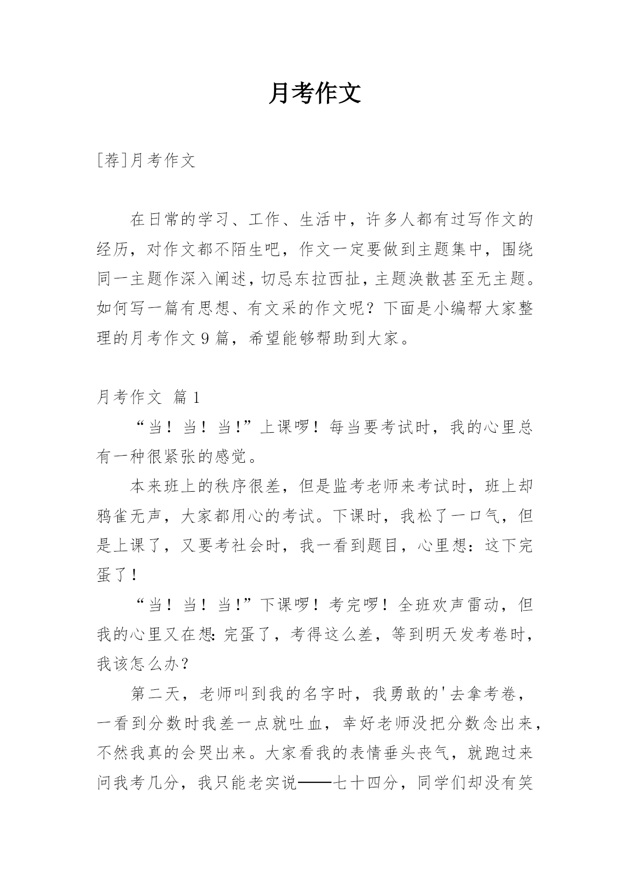 月考作文【经典】月考作文无论是在学校还是在社会中,大家都写过作文,肯定对各类作文都很熟悉吧,作文是一种言语活动,具有高度的综合性和创造性。怎么写作文才能避免踩雷呢?下面是小编帮大家整理的月考作文6篇,欢迎大家分享。月考作文篇1月考结束了,这次考试考的很不理想,语文我考得差不多,考了98分,但是数学和英语都考砸了,都考了80多分……进考场了,心里又紧张还有一分激动。第一场考了语文,试卷一发下来,我就写上姓名和考号,开始审题。到最后,卷纸发下来,错了两道题,都不应该错,还是没有好好检查。下一场是数学,这些题其
