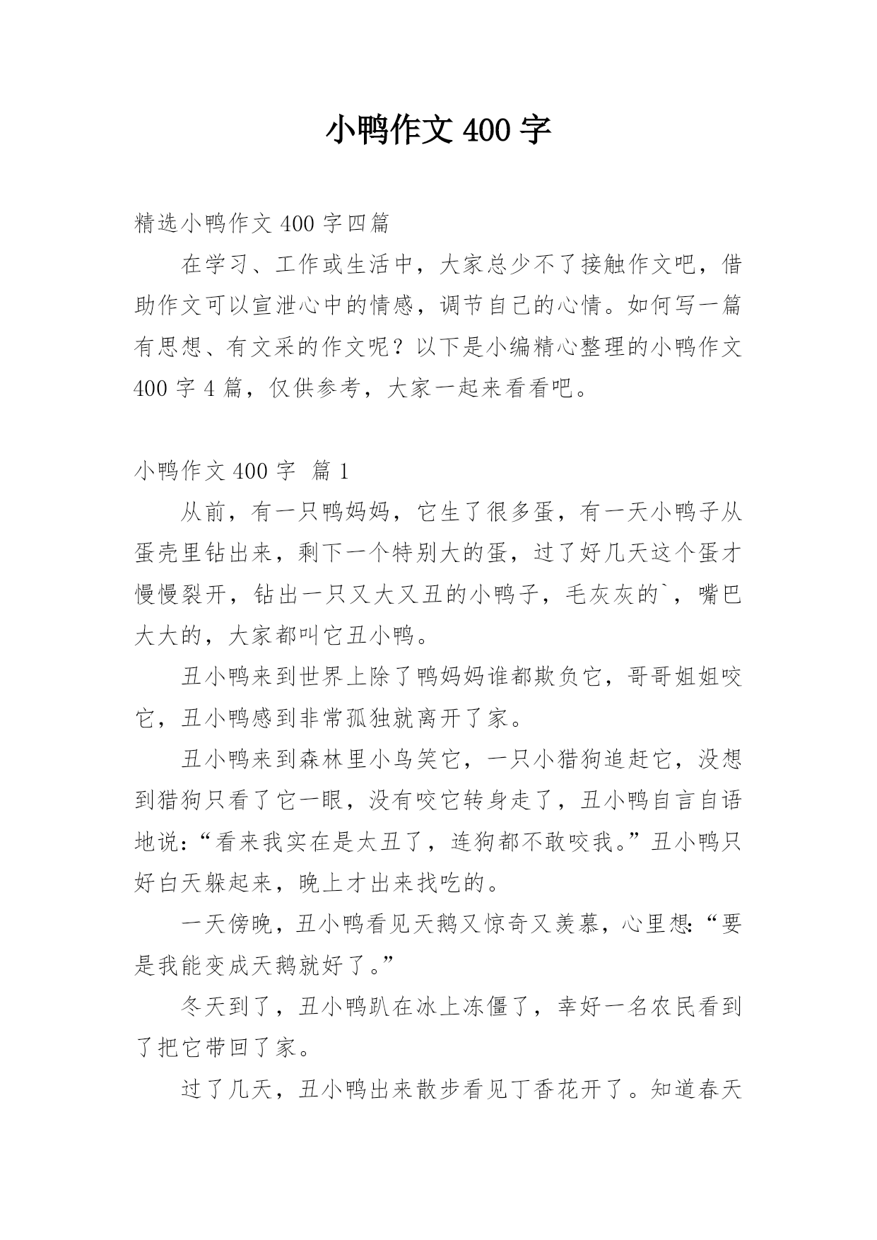 小鸭作文400字精选小鸭作文400字四篇在学习、工作或生活中,大家总少不了接触作文吧,借助作文可以宣泄心中的情感,调节自己的心情。如何写一篇有思想、有文采的作文呢?以下是小编精心整理的小鸭作文400字4篇,仅供参考,大家一起来看看吧。小鸭作文400字篇1从前,有一只鸭妈妈,它生了很多蛋,有一天小鸭子从蛋壳里钻出来,剩下一个特别大的蛋,过了好几天这个蛋才慢慢裂开,钻出一只又大又丑的小鸭子,毛灰灰的`,嘴巴大大的,大家都叫它丑小鸭。丑小鸭来到世界上除了鸭妈妈谁都欺负它,哥哥姐姐咬它,丑小鸭感到非常孤独就离开了