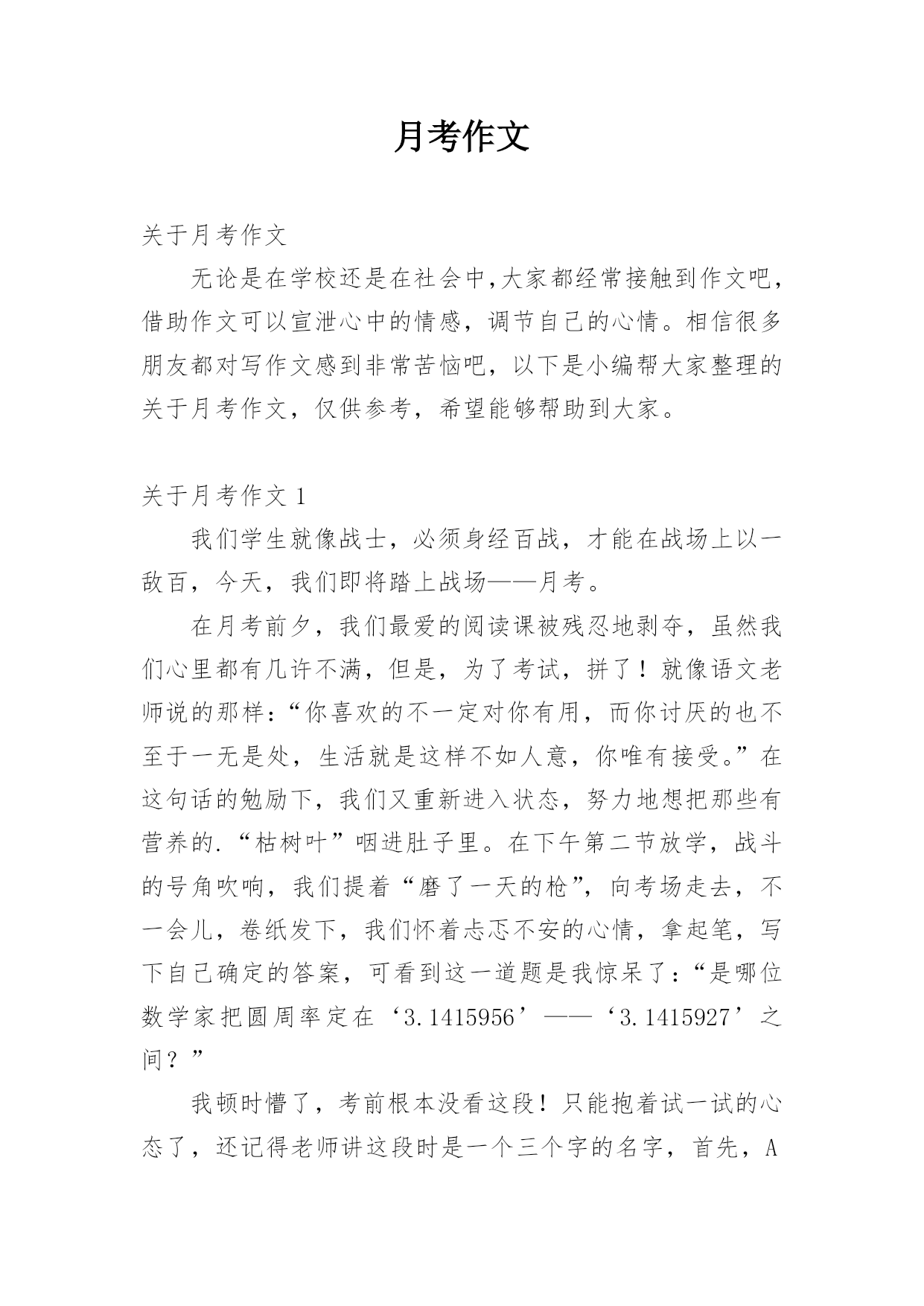 月考作文关于月考作文无论是在学校还是在社会中,大家都经常接触到作文吧,借助作文可以宣泄心中的情感,调节自己的心情。相信很多朋友都对写作文感到非常苦恼吧,以下是小编帮大家整理的关于月考作文,仅供参考,希望能够帮助到大家。关于月考作文1我们学生就像战士,必须身经百战,才能在战场上以一敌百,今天,我们即将踏上战场——月考。在月考前夕,我们最爱的阅读课被残忍地剥夺,虽然我们心里都有几许不满,但是,为了考试,拼了!就像语文老师说的那样:“你喜欢的不一定对你有用,而你讨厌的也不至于一无是处,生活就是这样不如人意,你唯