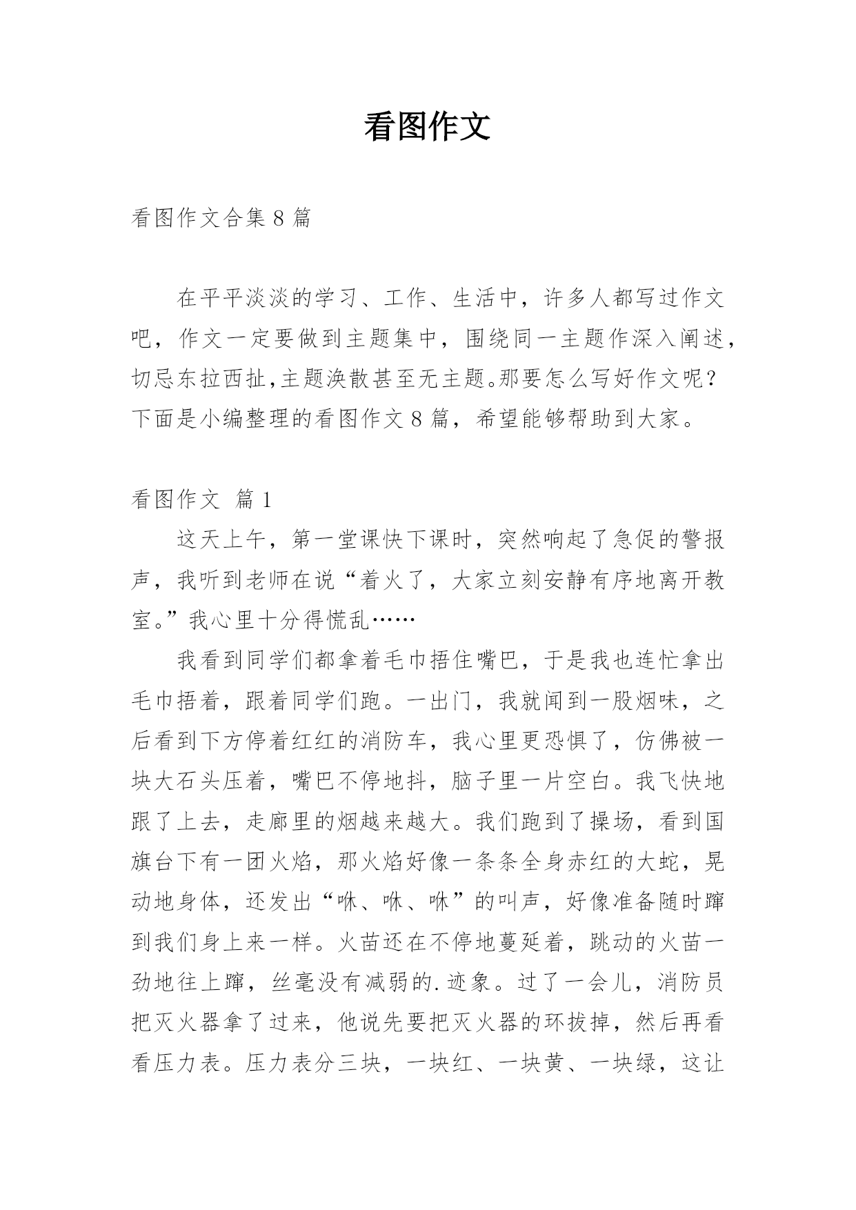 看图作文看图作文合集8篇在平平淡淡的学习、工作、生活中,许多人都写过作文吧,作文一定要做到主题集中,围绕同一主题作深入阐述,切忌东拉西扯,主题涣散甚至无主题。那要怎么写好作文呢?下面是小编整理的看图作文8篇,希望能够帮助到大家。看图作文篇1这天上午,第一堂课快下课时,突然响起了急促的警报声,我听到老师在说“着火了,大家立刻安静有序地离开教室。”我心里十分得慌乱……我看到同学们都拿着毛巾捂住嘴巴,于是我也连忙拿出毛巾捂着,跟着同学们跑。一出门,我就闻到一股烟味,之后看到下方停着红红的消防车,我心里更恐惧了,