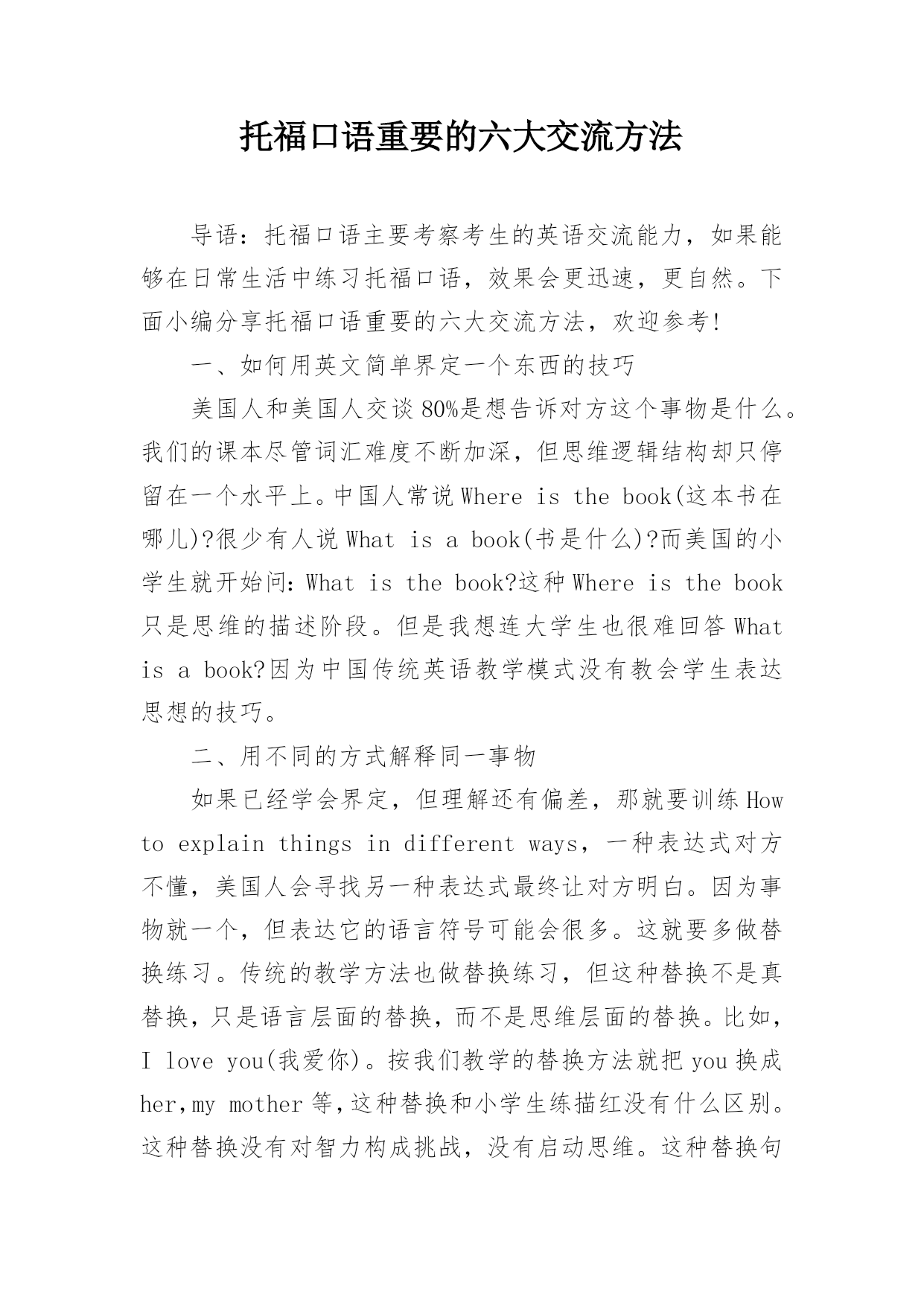 托福口语重要的六大交流方法导语:托福口语主要考察考生的英语交流能力,如果能够在日常生活中练习托福口语,效果会更迅速,更自然。下面小编分享托福口语重要的六大交流方法,欢迎参考!一、如何用英文简单界定一个东西的技巧美国人和美国人交谈80%是想告诉对方这个事物是什么。我们的课本尽管词汇难度不断加深,但思维逻辑结构却只停留在一个水平上。中国人常说Whereisthebook(这本书在哪儿)?很少有人说Whatisabook(书是什么)?而美国的小学生就开始问:Whatisthebook?这种Whereistheb