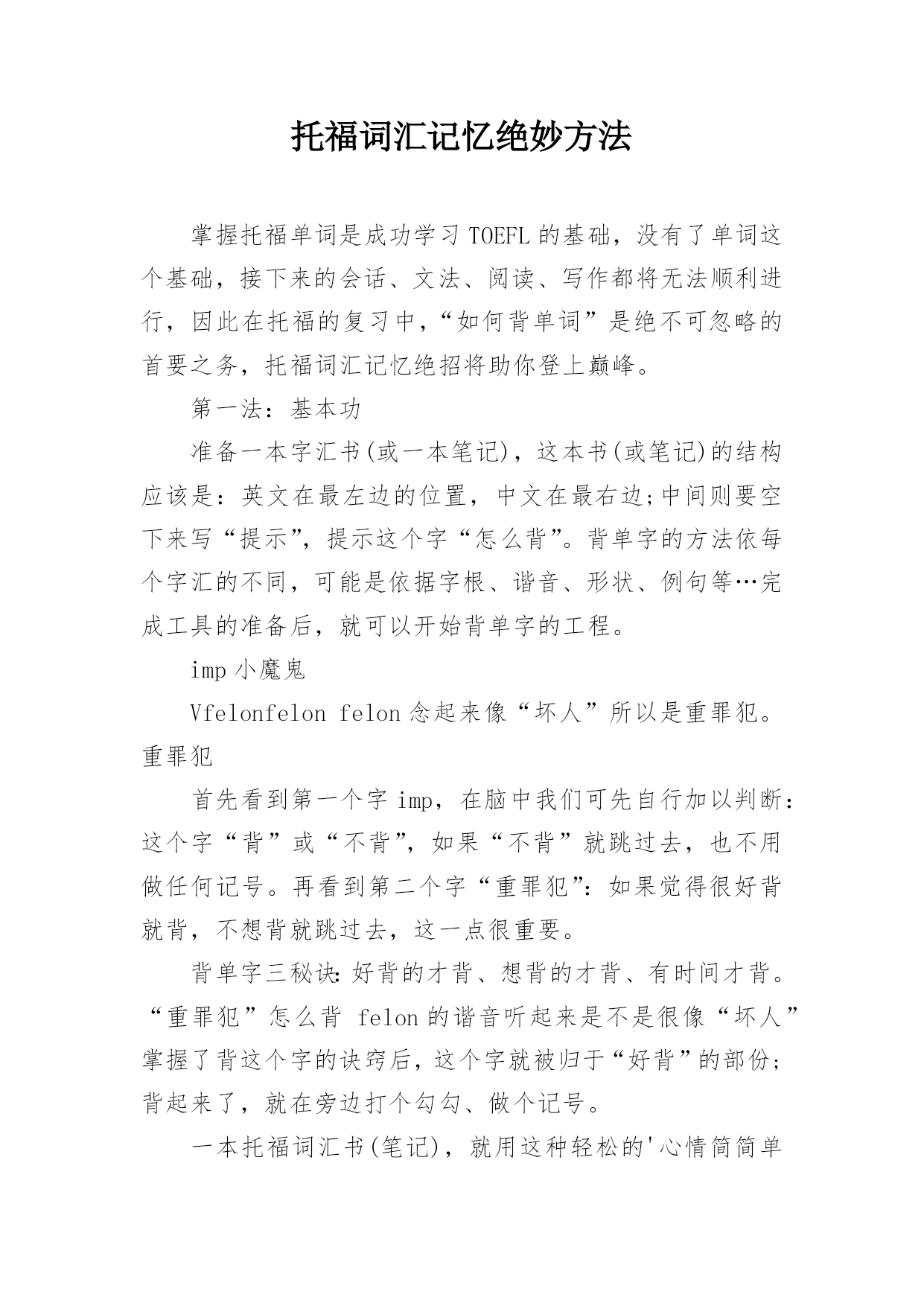 托福词汇记忆绝妙方法掌握托福单词是成功学习TOEFL的基础,没有了单词这个基础,接下来的会话、文法、阅读、写作都将无法顺利进行,因此在托福的复习中,“如何背单词”是绝不可忽略的首要之务,托福词汇记忆绝招将助你登上巅峰。第一法:基本功准备一本字汇书(或一本笔记),这本书(或笔记)的结构应该是:英文在最左边的位置,中文在最右边;中间则要空下来写“提示”,提示这个字“怎么背”。背单字的方法依每个字汇的不同,可能是依据字根、谐音、形状、例句等…完成工具的准备后,就可以开始背单字的工程。imp小魔鬼Vfelonfe