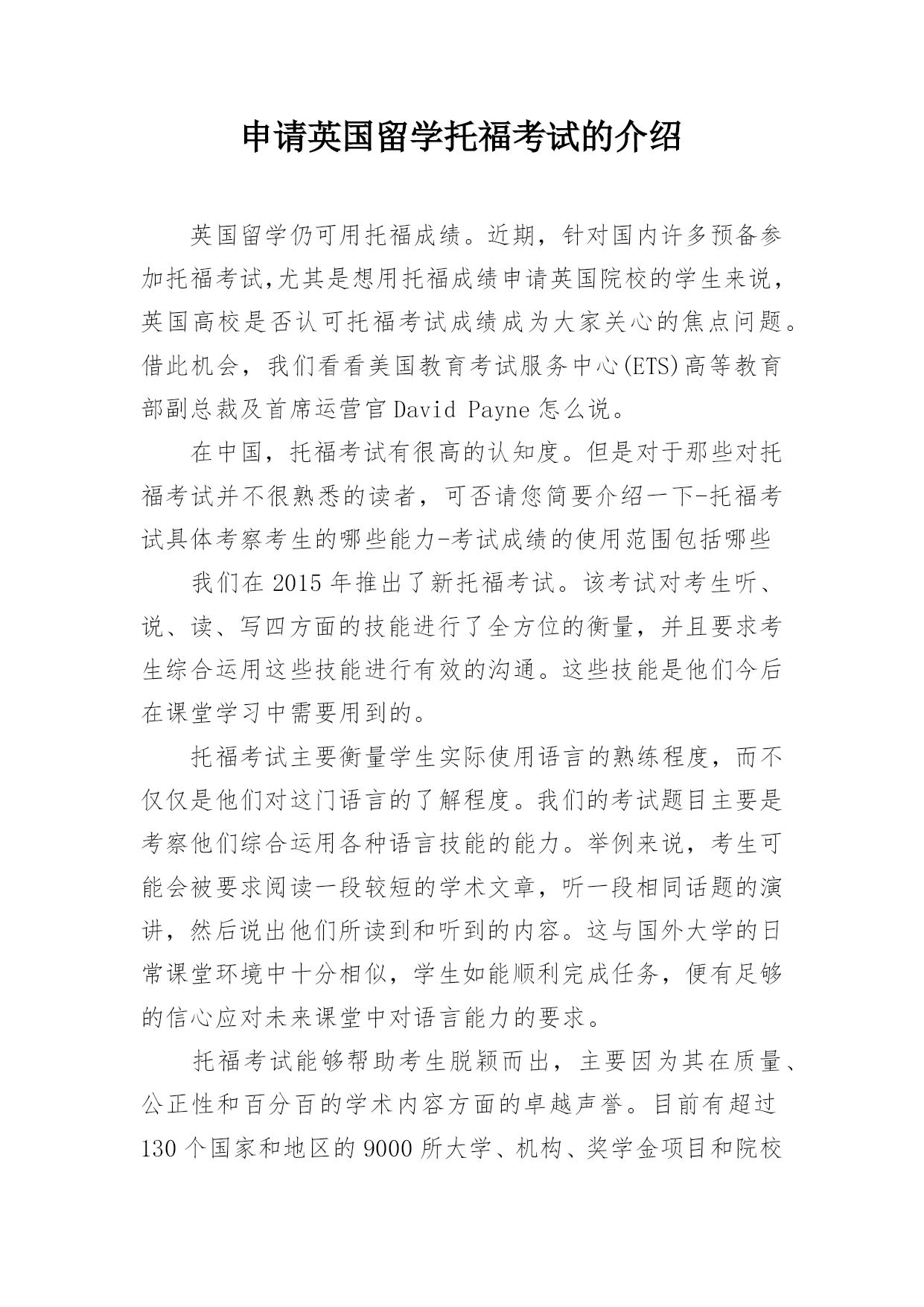 申请英国留学托福考试的介绍英国留学仍可用托福成绩。近期,针对国内许多预备参加托福考试,尤其是想用托福成绩申请英国院校的学生来说,英国高校是否认可托福考试成绩成为大家关心的焦点问题。借此机会,我们看看美国教育考试服务中心(ETS)高等教育部副总裁及首席运营官DavidPayne怎么说。在中国,托福考试有很高的认知度。但是对于那些对托福考试并不很熟悉的读者,可否请您简要介绍一下-托福考试具体考察考生的哪些能力-考试成绩的使用范围包括哪些我们在2015年推出了新托福考试。该考试对考生听、说、读、写四方面的技能进