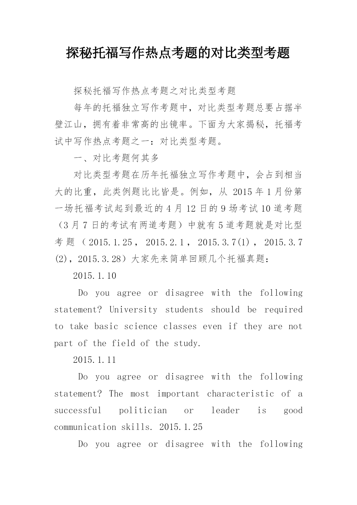 探秘托福写作热点考题的对比类型考题探秘托福写作热点考题之对比类型考题每年的托福独立写作考题中,对比类型考题总要占据半壁江山,拥有着非常高的出镜率。下面为大家揭秘,托福考试中写作热点考题之一:对比类型考题。一、对比考题何其多对比类型考题在历年托福独立写作考题中,会占到相当大的比重,此类例题比比皆是。例如,从2015年1月份第一场托福考试起到最近的4月12日的9场考试10道考题(3月7日的考试有两道考题)中就有5道考题就是对比型考题(2015.1.25,2015.2.1,2015.3.7(1),2015.3.