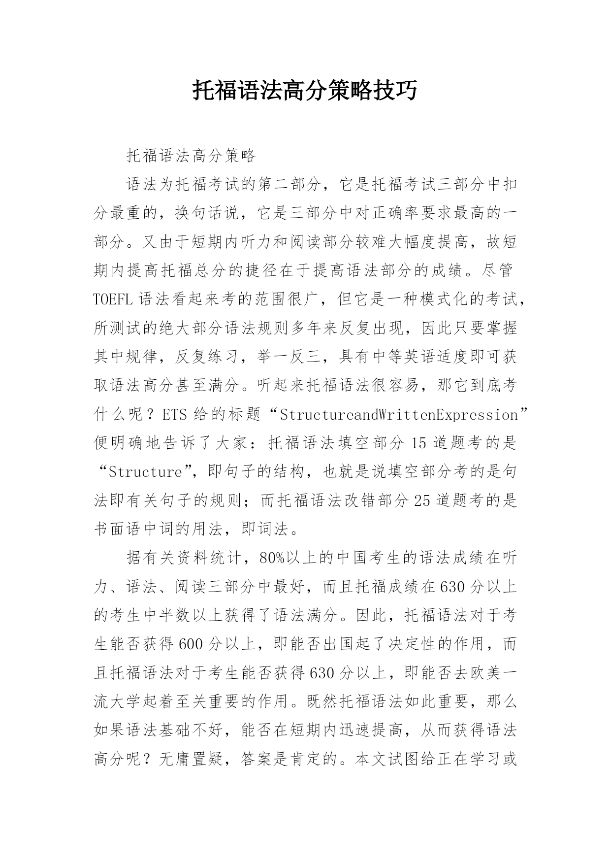 托福语法高分策略技巧托福语法高分策略语法为托福考试的第二部分,它是托福考试三部分中扣分最重的,换句话说,它是三部分中对正确率要求最高的一部分。又由于短期内听力和阅读部分较难大幅度提高,故短期内提高托福总分的捷径在于提高语法部分的成绩。尽管TOEFL语法看起来考的范围很广,但它是一种模式化的考试,所测试的绝大部分语法规则多年来反复出现,因此只要掌握其中规律,反复练习,举一反三,具有中等英语适度即可获取语法高分甚至满分。听起来托福语法很容易,那它到底考什么呢?ETS给的标题“StructureandWritt