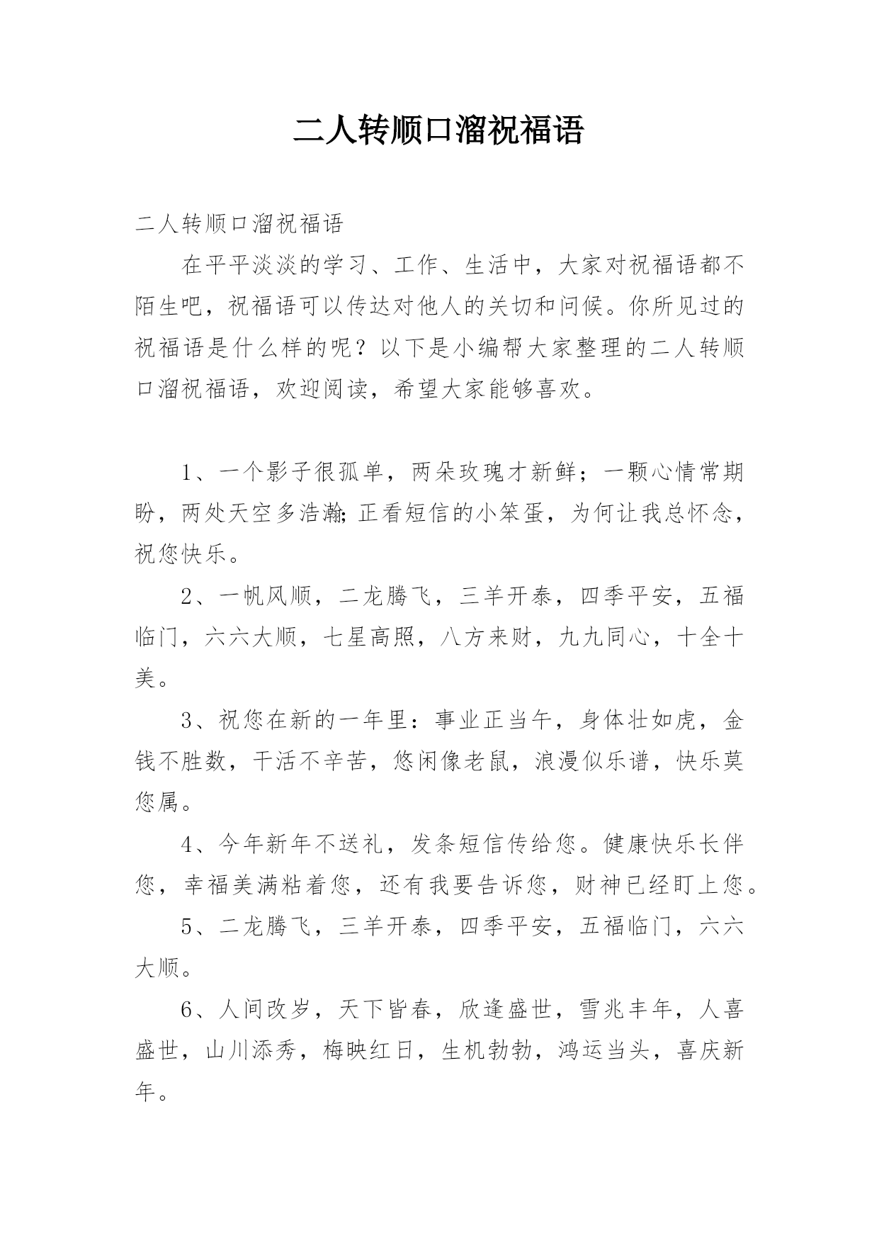 二人转顺口溜祝福语二人转顺口溜祝福语在平平淡淡的学习、工作、生活中,大家对祝福语都不陌生吧,祝福语可以传达对他人的关切和问候。你所见过的祝福语是什么样的呢?以下是小编帮大家整理的二人转顺口溜祝福语,欢迎阅读,希望大家能够喜欢。1、一个影子很孤单,两朵玫瑰才新鲜;一颗心情常期盼,两处天空多浩瀚;正看短信的小笨蛋,为何让我总怀念,祝您快乐。2、一帆风顺,二龙腾飞,三羊开泰,四季平安,五福临门,六六大顺,七星高照,八方来财,九九同心,十全十美。3、祝您在新的一年里:事业正当午,身体壮如虎,金钱不胜数,干活不辛苦