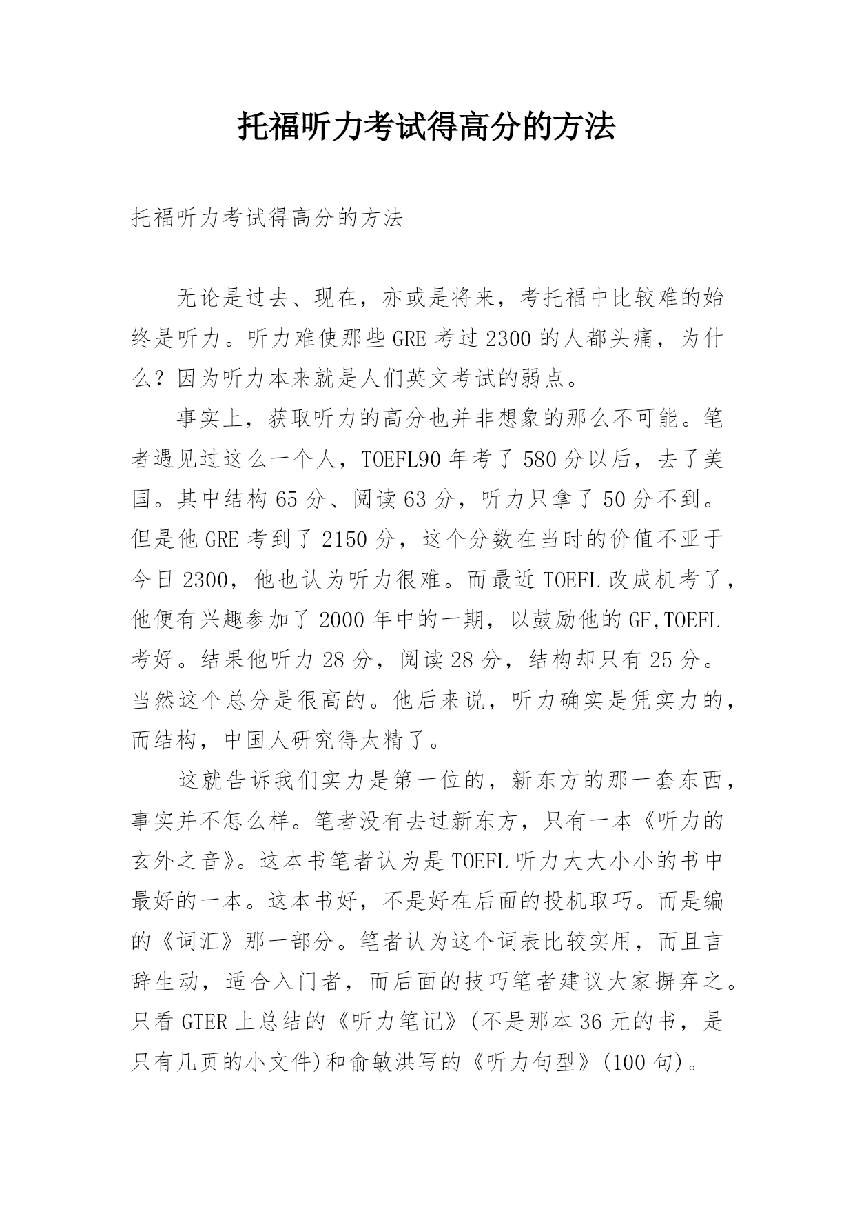 托福听力考试得高分的方法托福听力考试得高分的方法无论是过去、现在,亦或是将来,考托福中比较难的始终是听力。听力难使那些GRE考过2300的人都头痛,为什么?因为听力本来就是人们英文考试的弱点。事实上,获取听力的高分也并非想象的那么不可能。笔者遇见过这么一个人,TOEFL90年考了580分以后,去了美国。其中结构65分、阅读63分,听力只拿了50分不到。但是他GRE考到了2150分,这个分数在当时的价值不亚于今日2300,他也认为听力很难。而最近TOEFL改成机考了,他便有兴趣参加了2000年中的一期,以鼓