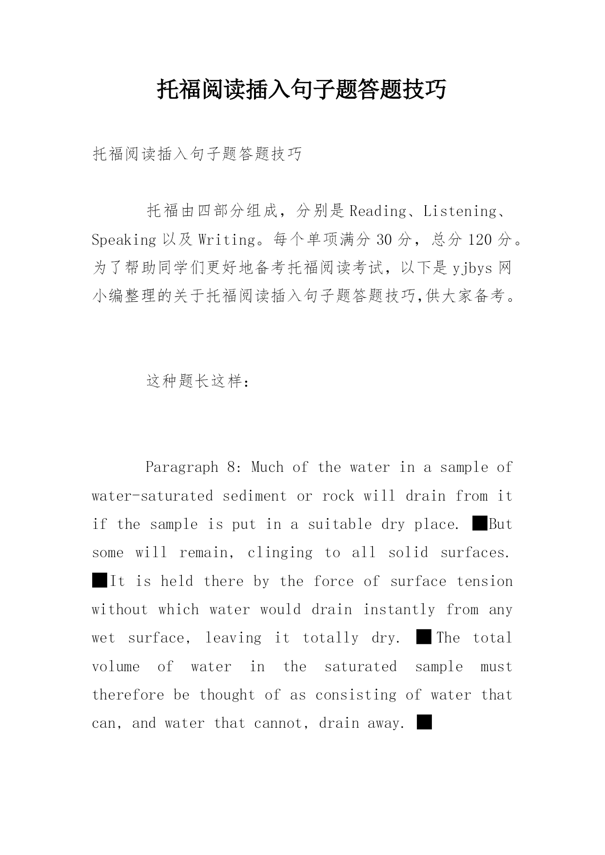 托福阅读插入句子题答题技巧托福阅读插入句子题答题技巧托福由四部分组成,分别是Reading、Listening、Speaking以及Writing。每个单项满分30分,总分120分。为了帮助同学们更好地备考托福阅读考试,以下是yjbys网小编整理的关于托福阅读插入句子题答题技巧,供大家备考。这种题长这样:Paragraph8:Muchofthewaterinasampleofwater-saturatedsedimentorrockwilldrainfromitifthesampleisputinasui