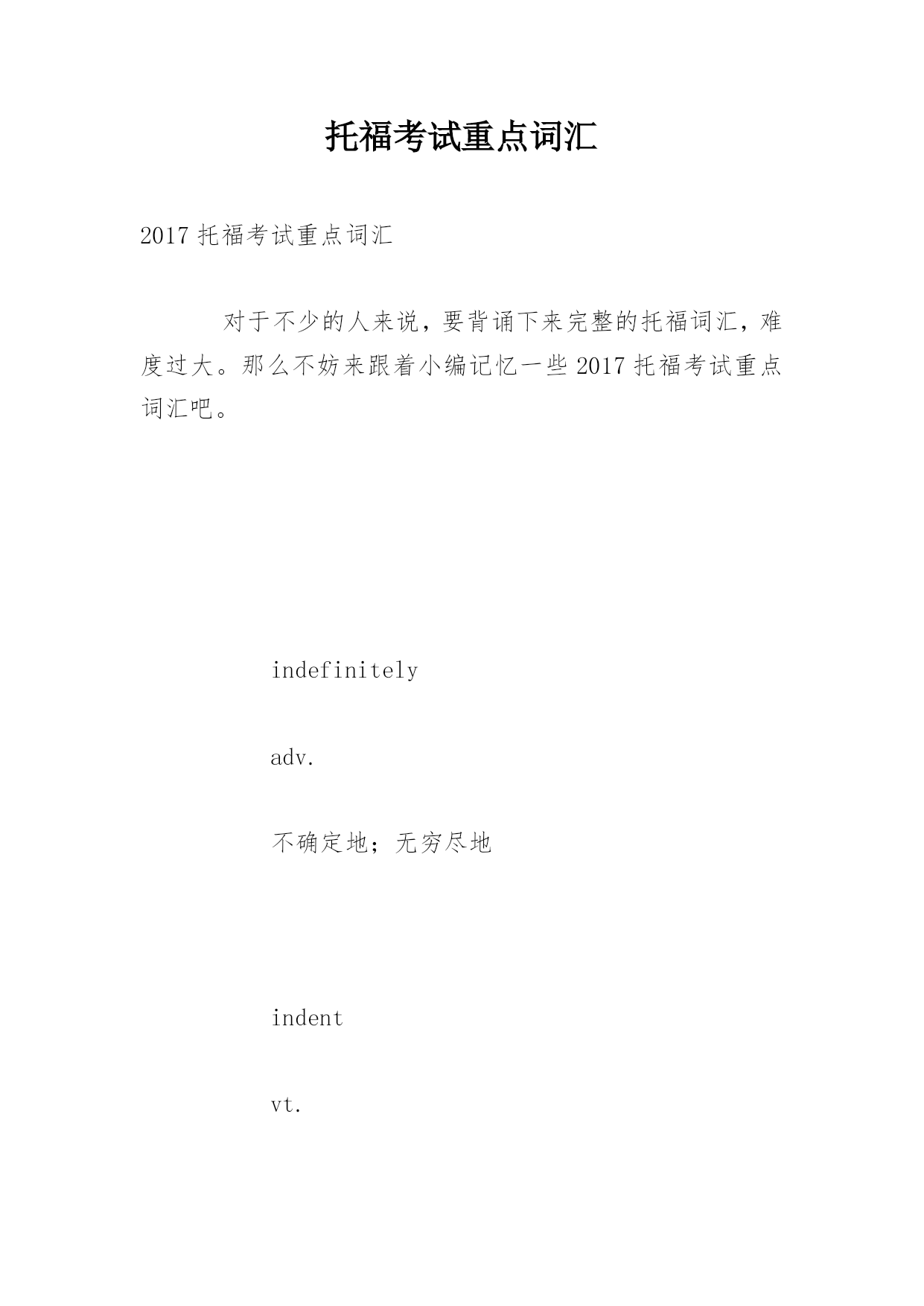 托福考试重点词汇2017托福考试重点词汇对于不少的人来说,要背诵下来完整的托福词汇,难度过大。那么不妨来跟着小编记忆一些2017托福考试重点词汇吧。indefinitelyadv.不确定地;无穷尽地indentvt.切割成锯齿状indentedadj.锯齿状的,高低不平的indenturevt.以契约约束indicatevt.指示,指出;象征,表明indicativeadj.指示的,预示的indifferentadj.不感兴趣的,漠不关心的indifferencen.冷漠,不关心indigestionn.