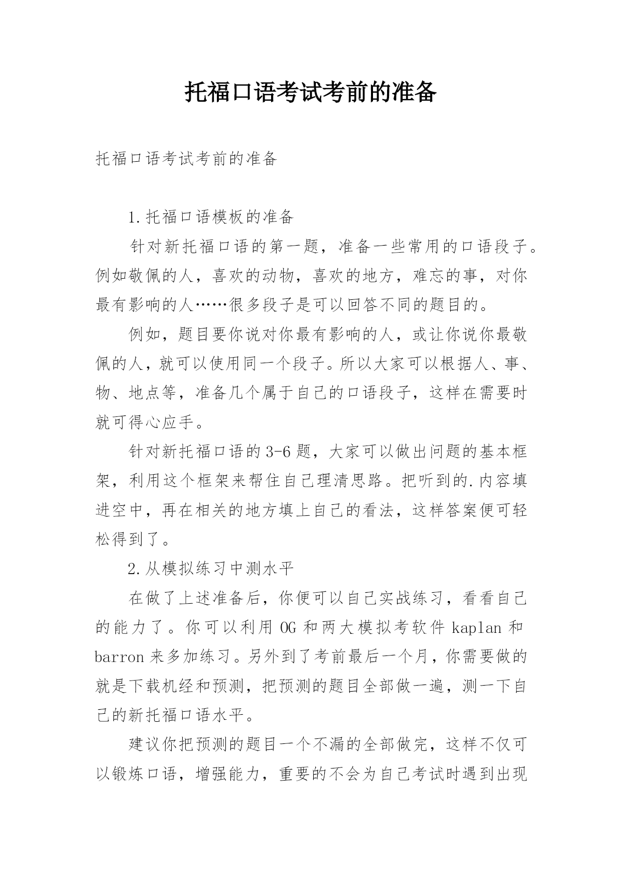 托福口语考试考前的准备托福口语考试考前的准备1.托福口语模板的准备针对新托福口语的第一题,准备一些常用的口语段子。例如敬佩的人,喜欢的动物,喜欢的地方,难忘的事,对你最有影响的人……很多段子是可以回答不同的题目的。例如,题目要你说对你最有影响的人,或让你说你最敬佩的人,就可以使用同一个段子。所以大家可以根据人、事、物、地点等,准备几个属于自己的口语段子,这样在需要时就可得心应手。针对新托福口语的3-6题,大家可以做出问题的基本框架,利用这个框架来帮住自己理清思路。把听到的.内容填进空中,再在相关的地方填上
