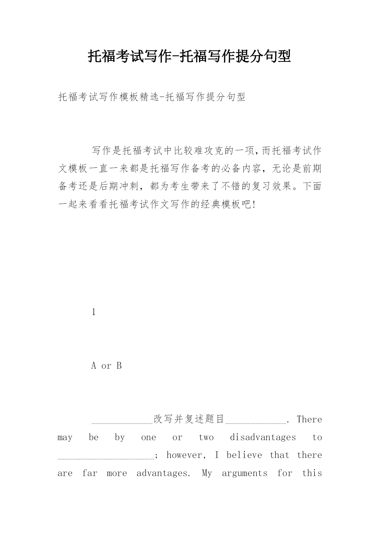 托福考试写作-托福写作提分句型托福考试写作模板精选-托福写作提分句型写作是托福考试中比较难攻克的一项,而托福考试作文模板一直一来都是托福写作备考的必备内容,无论是前期备考还是后期冲刺,都为考生带来了不错的复习效果。下面一起来看看托福考试作文写作的经典模板吧!1AorB____________改写并复述题目____________.Theremaybebyoneortwodisadvantagesto___________________;however,Ibelievethattherearefarmor
